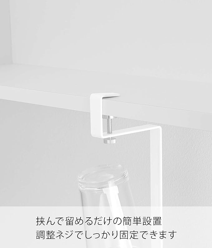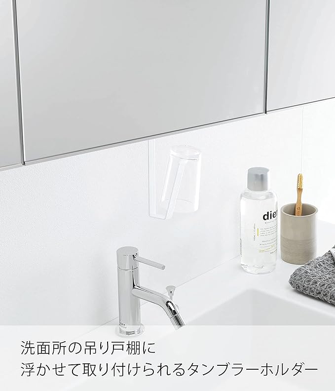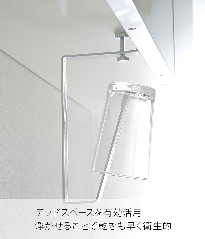 洗面所の吊り戸棚に浮かせて取り付けられるタンブラーホルダー。洗面台に浮かせてスッキリ整頓。浮いているから乾きが早く衛生的です。調整ネジでしっかり固定。