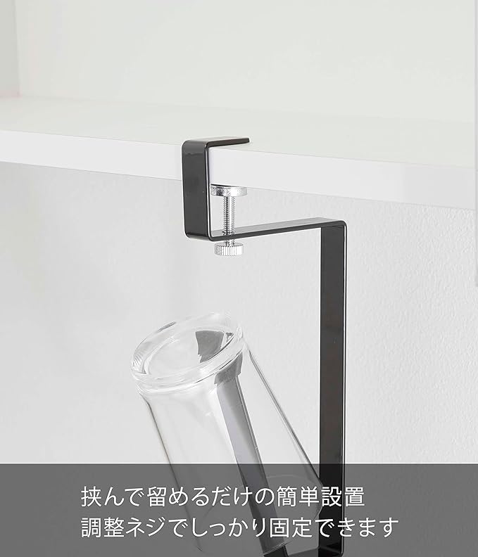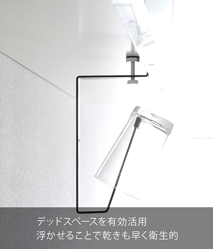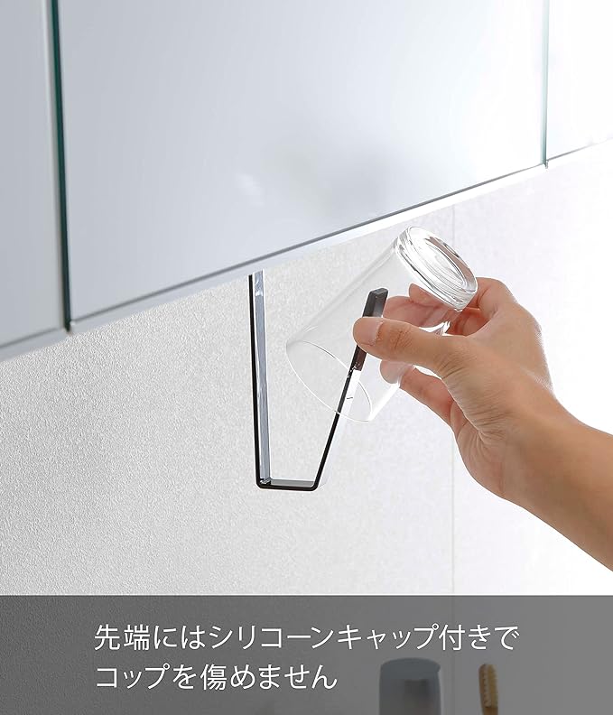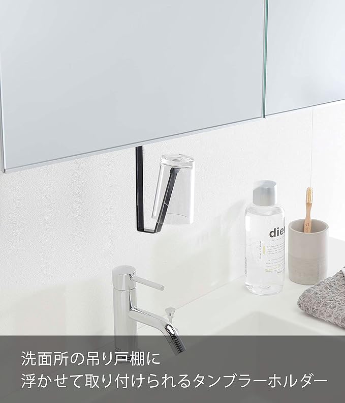 洗面所の吊り戸棚に浮かせて取り付けられるタンブラーホルダー。洗面台に浮かせてスッキリ整頓。浮いているから乾きが早く衛生的です。調整ネジでしっかり固定。