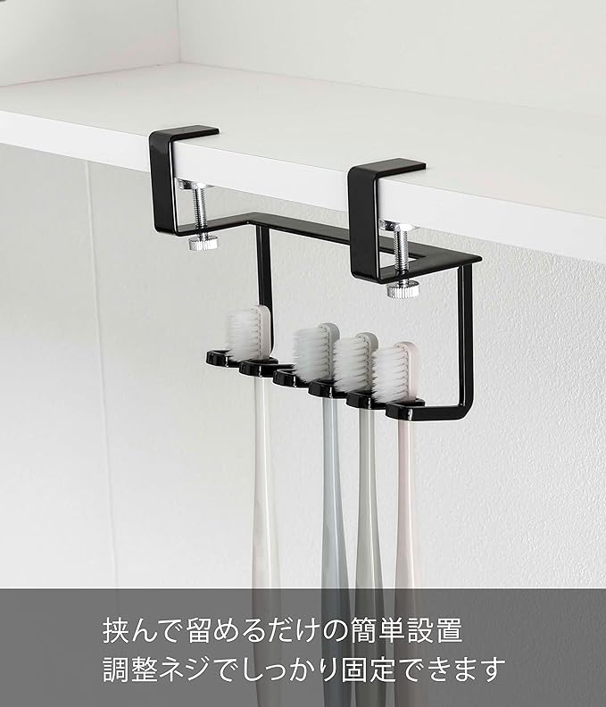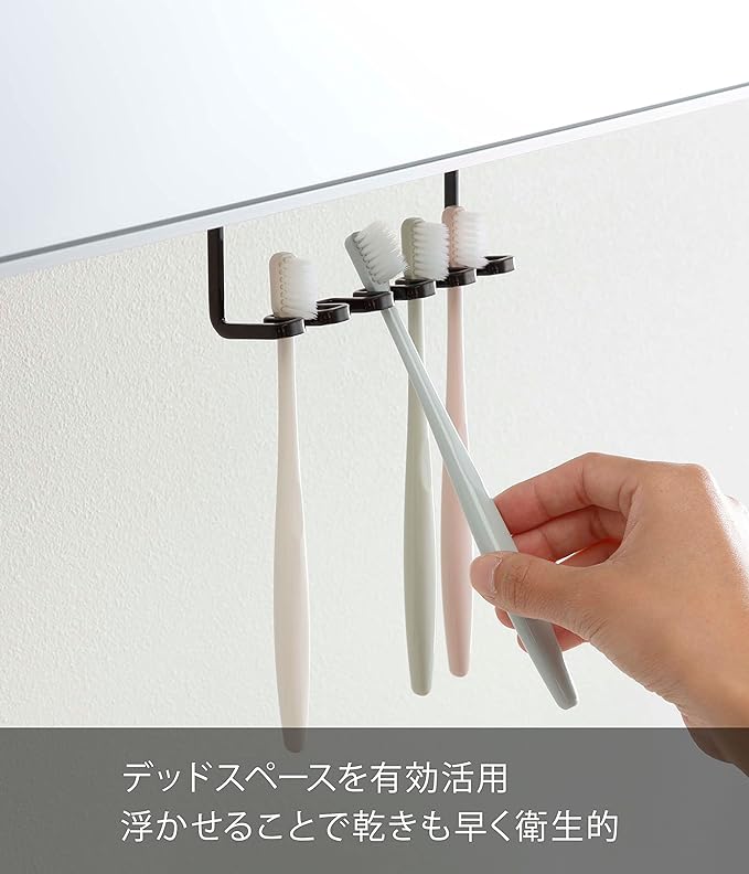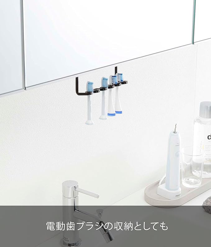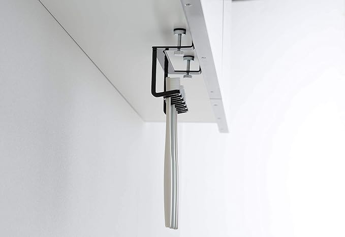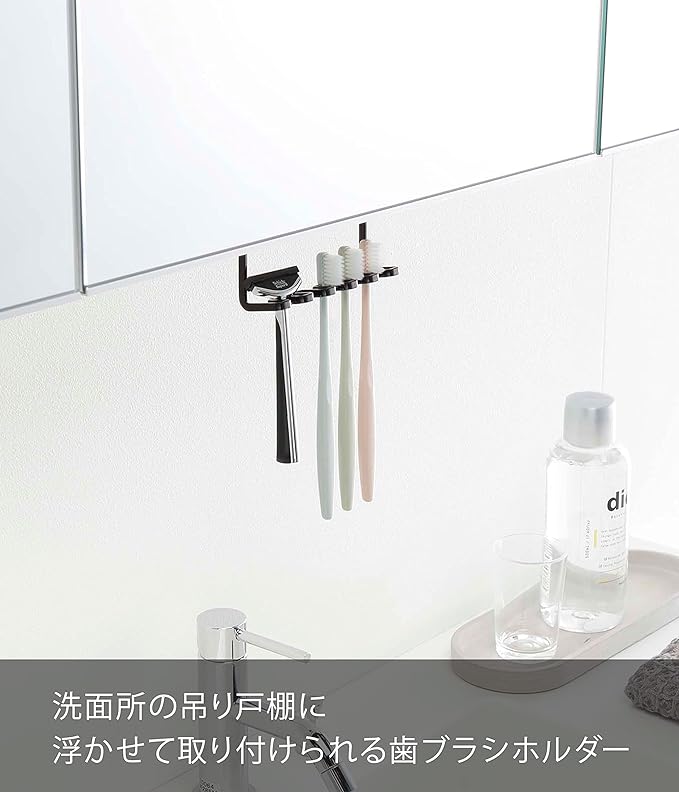 洗面所の吊り戸棚に浮かせて取り付けられる歯ブラシホルダー。洗面台に浮かせてスッキリ整頓。シェーバーの収納にも便利。電動歯ブラシの先端の収納にも。調整ネジでしっかり固定。
