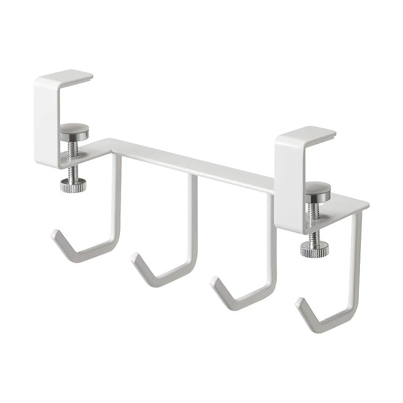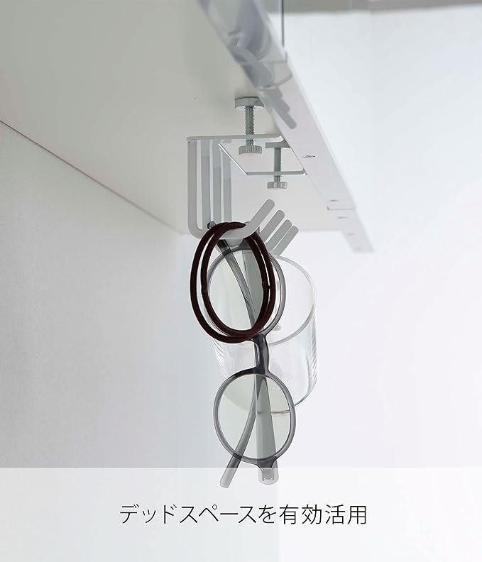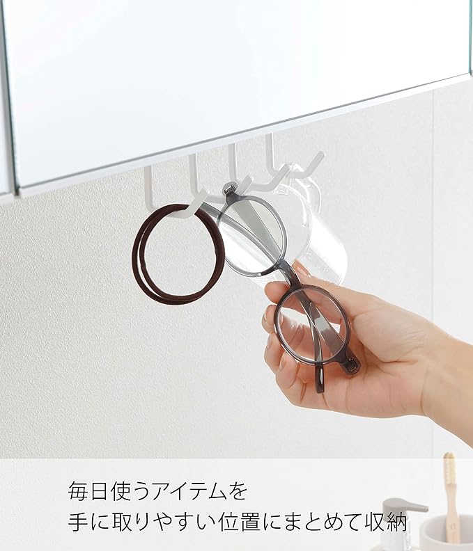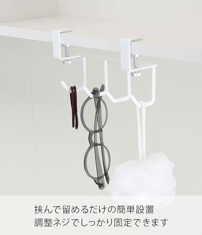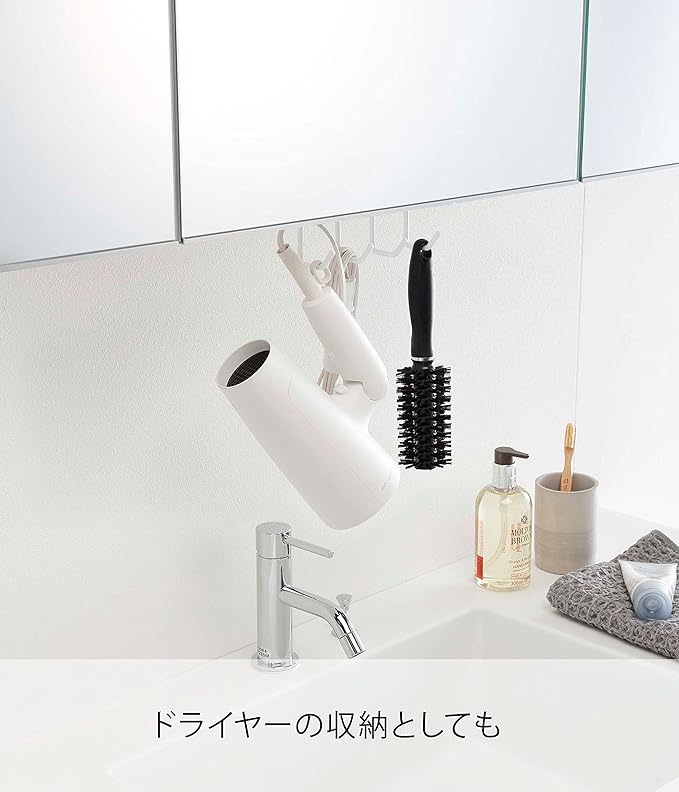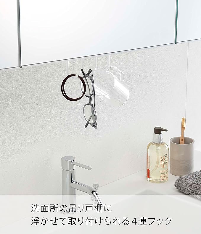 洗面所の吊り戸棚に浮かせて取り付けられるフック4連。洗面台に浮かせてスッキリ整頓。引っ掛けて収納するだけ。ドライヤーやブラシの収納にも。調整ネジでしっかり固定。