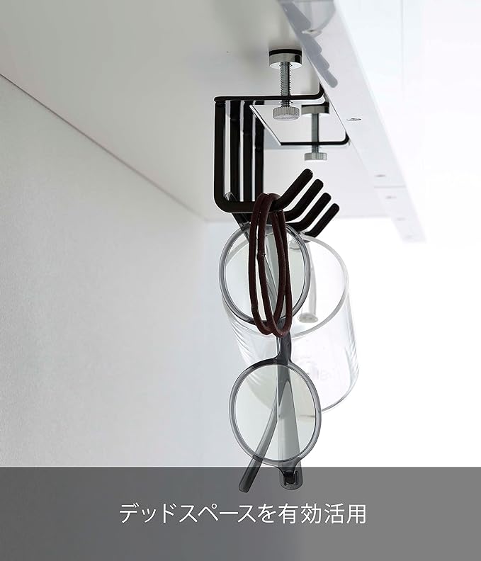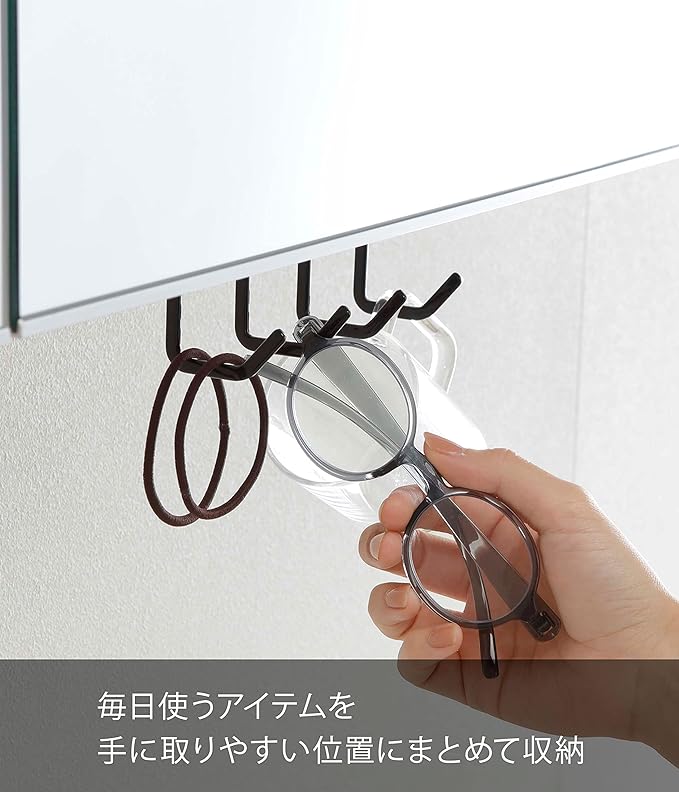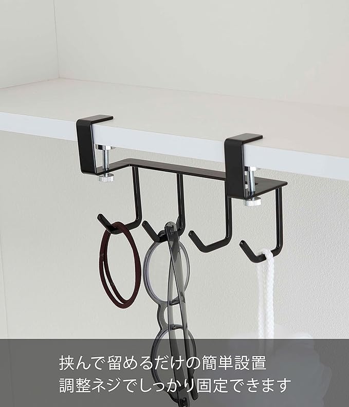 洗面所の吊り戸棚に浮かせて取り付けられるフック4連。洗面台に浮かせてスッキリ整頓。引っ掛けて収納するだけ。ドライヤーやブラシの収納にも。調整ネジでしっかり固定。
