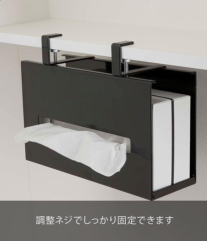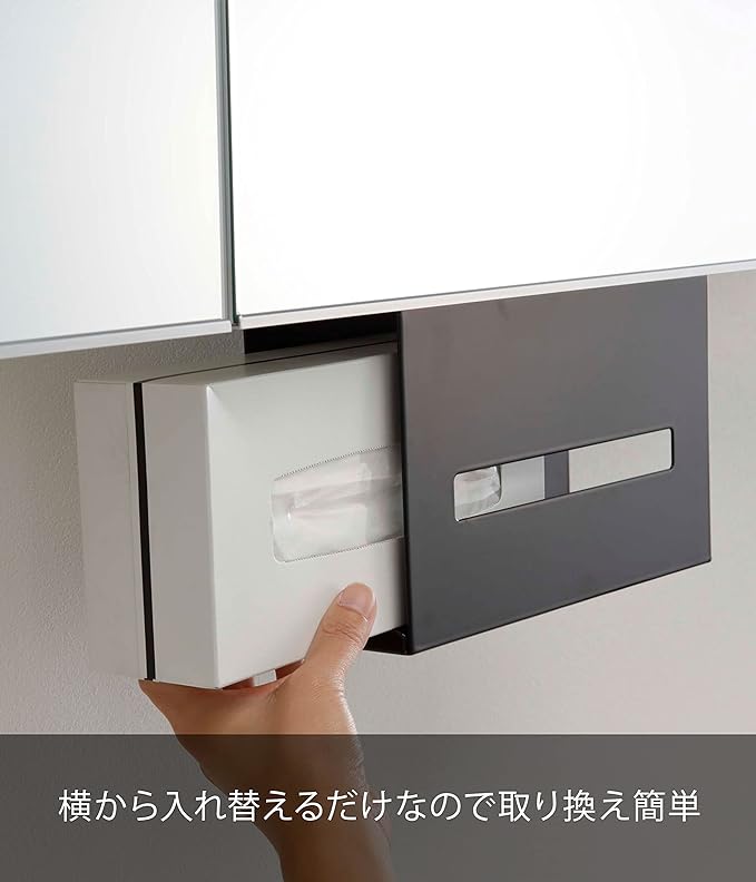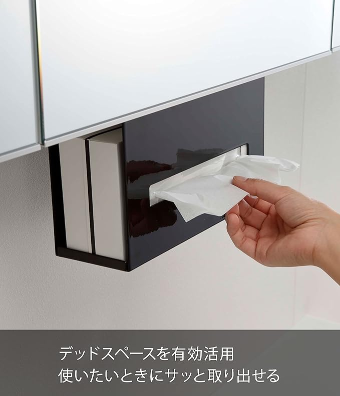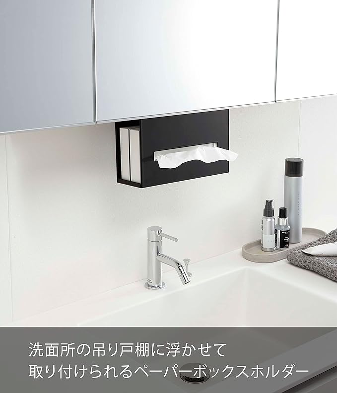 洗面所の吊り戸棚に浮かせて取り付けられるペーパーボックスホルダー。洗面台に浮かせてスッキリ整頓。横から入れ替えるだけの簡単収納。調整ネジでしっかり固定。