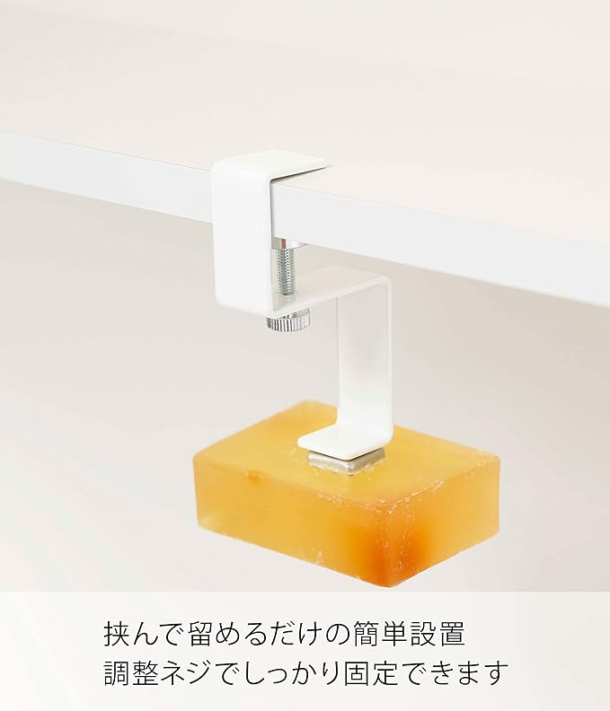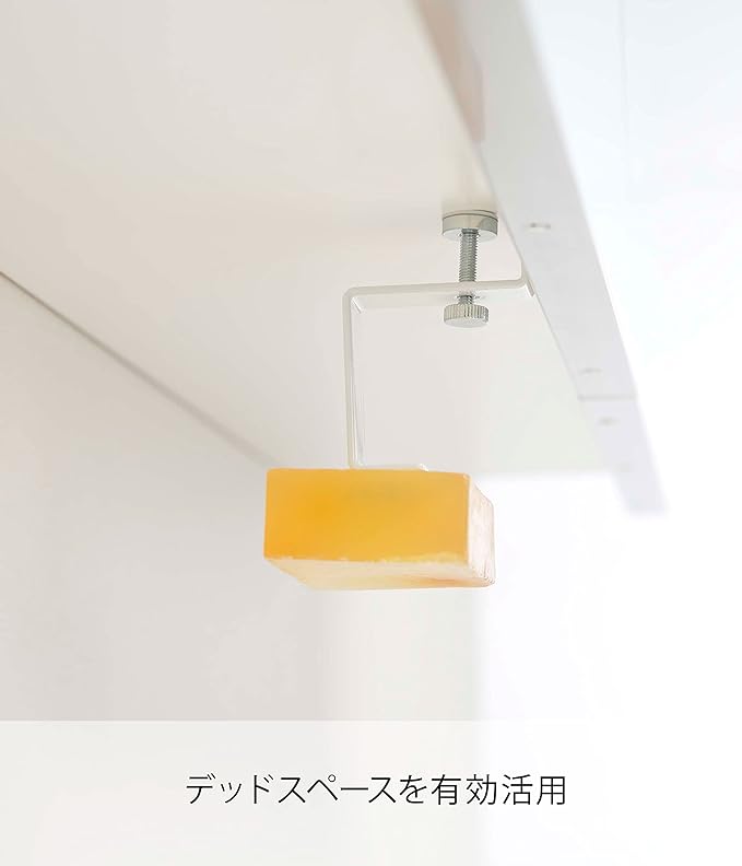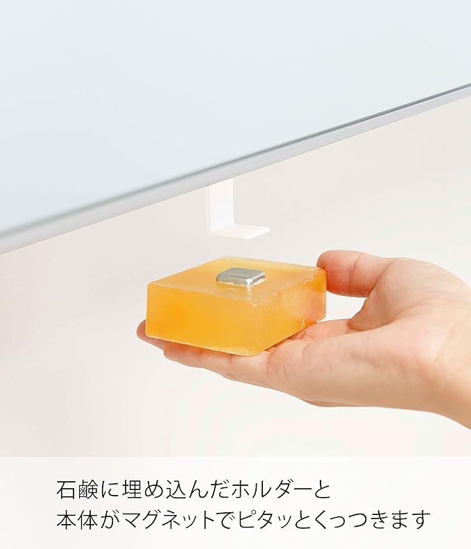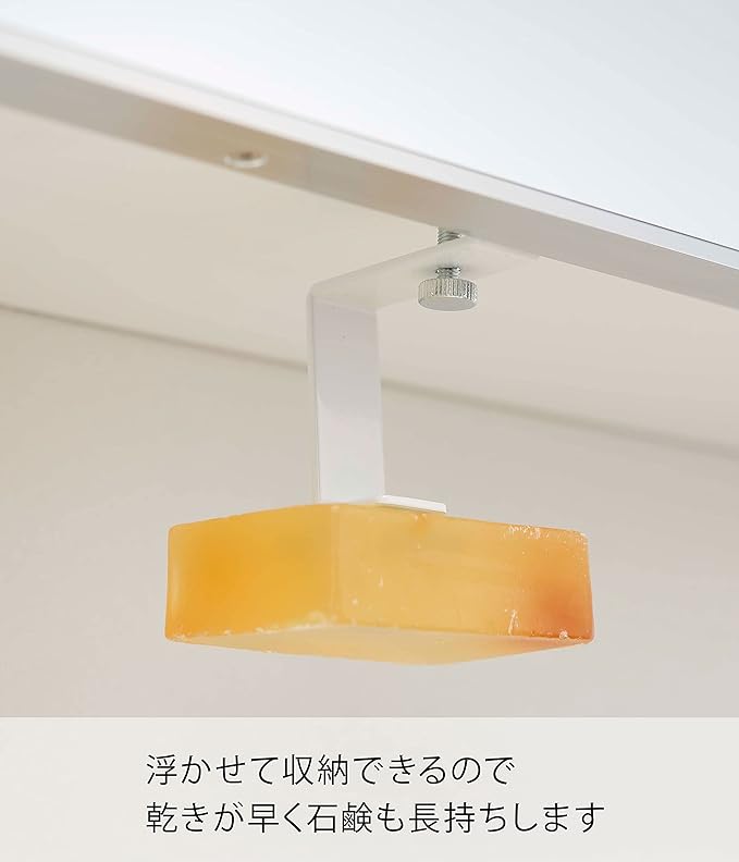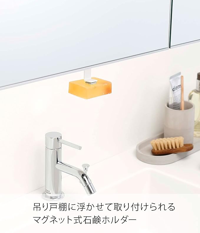 洗面所の吊り戸棚に浮かして取り付けられるマグネット式石鹸ホルダー。洗面台に浮かせてスッキリ整頓。浮いているから乾きも早く、石鹸が長持ちします。調整ネジでしっかり固定。