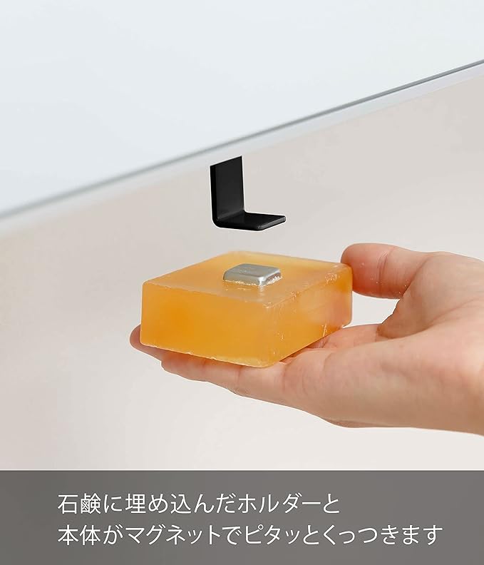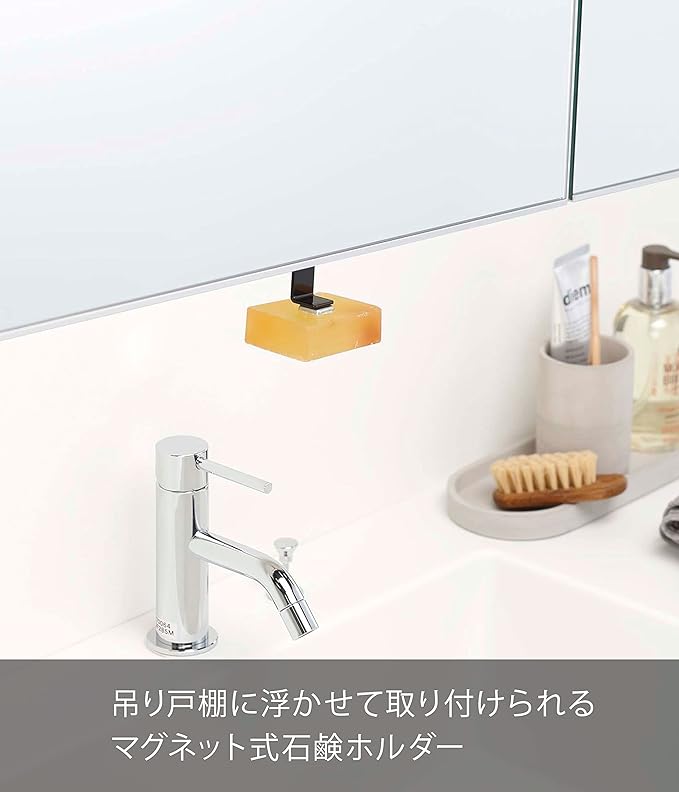 洗面所の吊り戸棚に浮かして取り付けられるマグネット式石鹸ホルダー。洗面台に浮かせてスッキリ整頓。浮いているから乾きも早く、石鹸が長持ちします。調整ネジでしっかり固定。