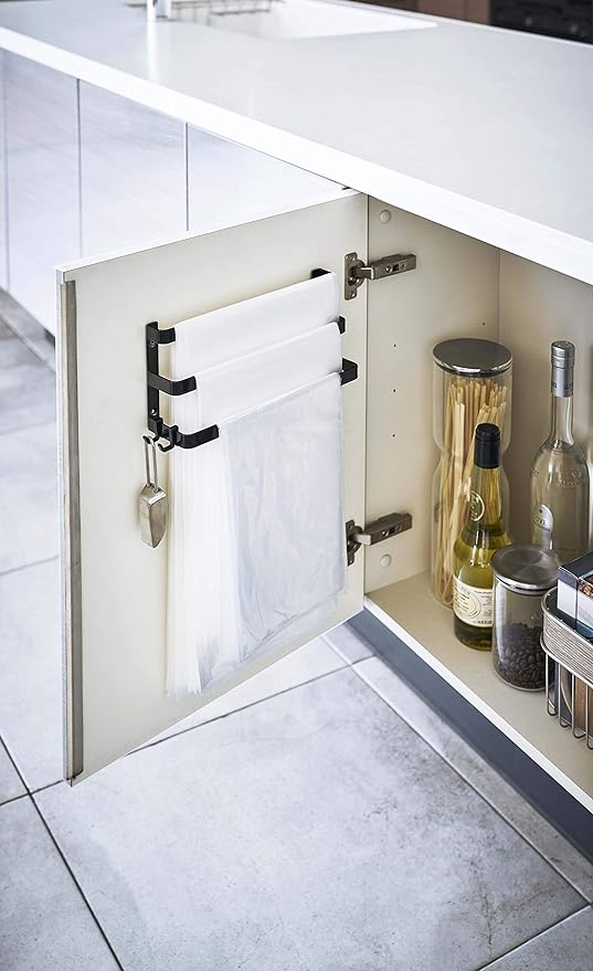 シンク扉に引っ掛けるだけの簡単取り付け。扉の外側にはタオルハンガー、扉の内側にはゴミ袋ホルダーが3段付いています。高さが3cm間隔で調整でき、シンクの深さ約20cmまで設置できます。開き戸・引き出しのどちらにも対応。フックが4個付いているのでキッチン小物の収納にも便利です。付属のゴミ袋ホルダーは収納するものに合わせて上下どちら向きでも取り付けできます。