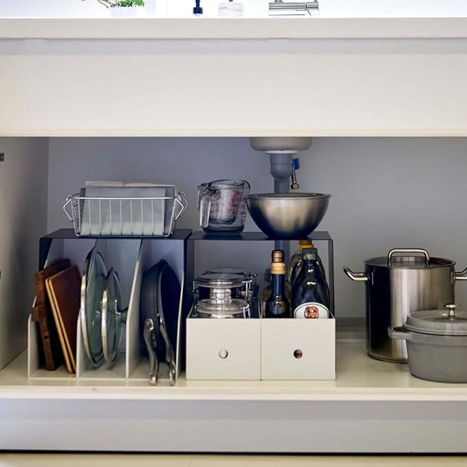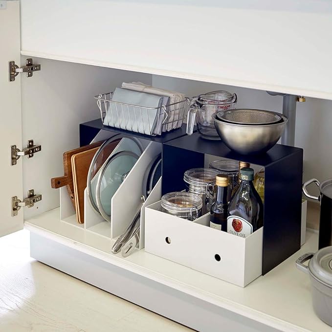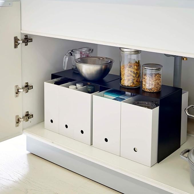 収納ボックス上のデッドスペースを有効活用。収納スペースを確保するのに便利な2個組のラック.収納ボックスやバスケット、横型のファイルボックスなどの上に置くだけ。今まで諦めていたスペースに直接収納したり、浅型のバスケットを置いたりできる便利なラックです。キッチンだけでなく洗面所や本棚でも便利に使用できます。