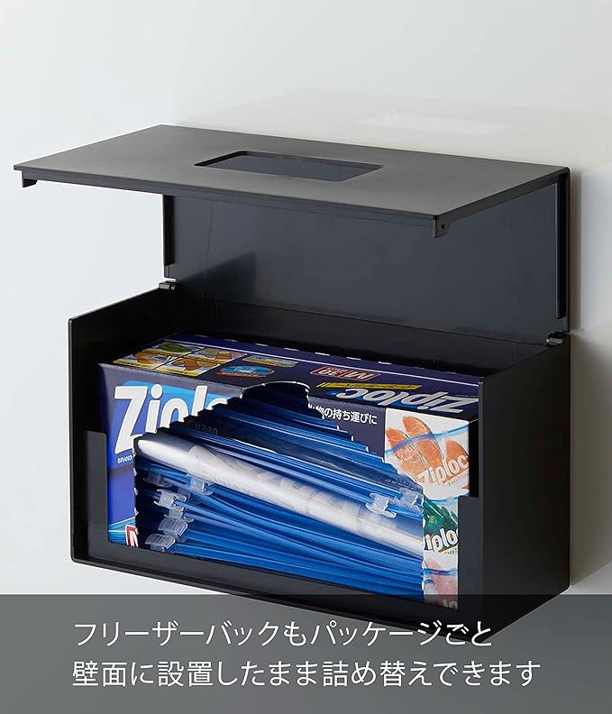 マグネットで取り付けたまま前から蓋が開けられる。キッチン整理に便利なボックスホルダー。キッチンで散らかりがちなビニール袋のボックス類を収納できます。ガードがあるので、ばらつく小物類も収納していただけます。コンパクトなのでキッチン横に置いても邪魔になりません。引き出しの中でもお使い頂けます。蓋が大きく開くので出し入れしやすい。取り出し口が大きいので、片手でサッと取り出せます。指で引っ掛けて前から簡単に開けられます。使い方はあなた次第。用途に応じて使いわけできます。