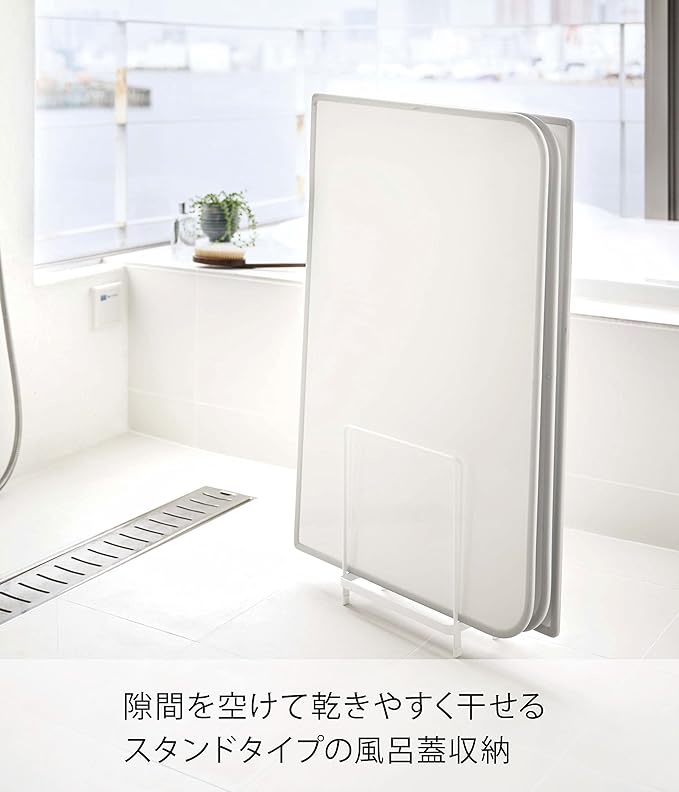 隙間を空けて乾きやすく干せる、風呂蓋スタンド。浮かせているので底がぬめらずお手入れも簡単。風通し良く収納できるので乾きやすく収納できます。接地面が少ないので、床のお掃除もラクラク。シャッタータイプの風呂蓋も丸めずに広げて収納できるので、カビやぬめりが発生しにくく快適です。