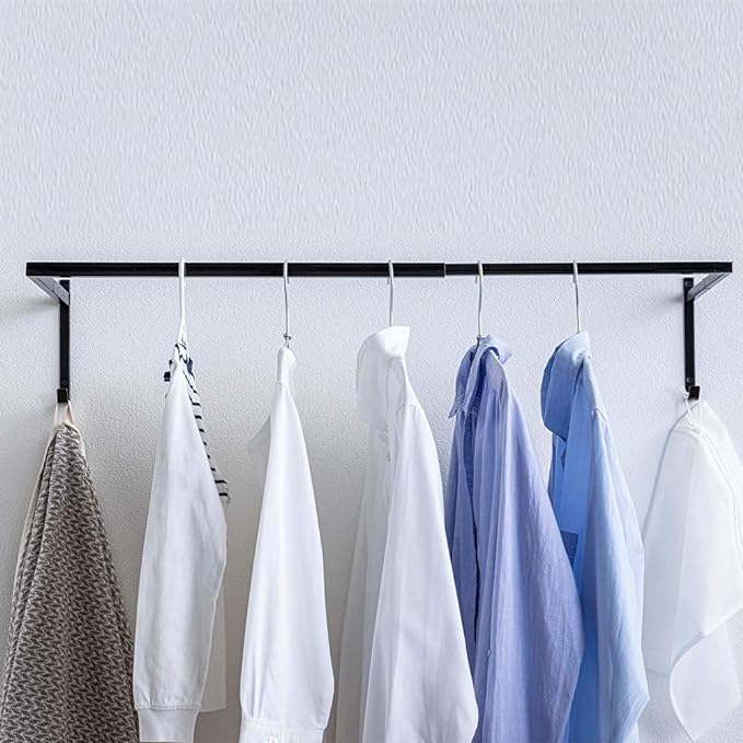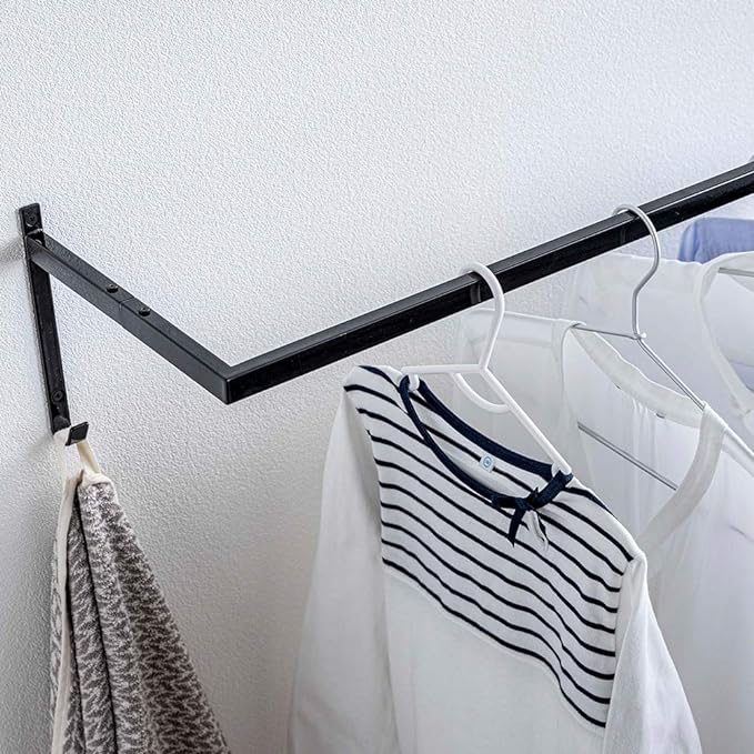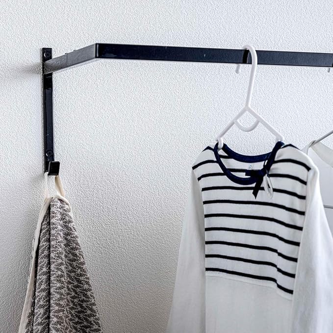 浴室などの扉の木枠や両サイドの下地材に木ネジで簡単取り付け。浴室扉前が物干しスペースに。足りない物干しスペースの確保に便利な物干しハンガー。伸縮式なので様々なサイズの浴室扉前に取り付けられます。ランドリールームやお部屋の壁に取り付けて洗濯物の干場や収納としても。引っ掛け収納に便利なフック付き。壁付けで洋服の収納ハンガーとしても使えます。