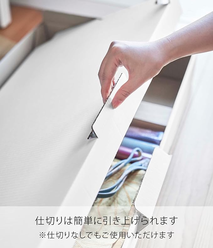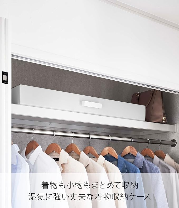 着物をコンパクト&スタイリッシュに収納 着物も小物もまとめて収納でき、湿気にも強い丈夫な着物収納ケースです。シンプルなデザインで和室にも洋室にもなじみます。高い場所に保管していても取り出しやすい樹脂製の取っ手付きです。着物のほか、大切にとっておきたいお子さんの作品収納にも。着物が映える、2色のカラーバリエーション カラーは、明るい印象のホワイト、スタイリッシュなブラックをご用意しました。華やかな着物の色や柄を邪魔しないシンプルなモノトーンカラーです。居室のインテリアやお好みに合わせてカラーをお選びください。着物と小物を分けて保管できる二段構造 上下に分けられる仕切り付きなので、着物と小物を分けて収納できます。一段目は帯や帯揚げ、帯締めなど。二段目には着物だけを、というように保管すればごちゃごちゃせずにスッキリと収納できます。仕切りは持ち手付きなので簡単に引き上げられ、また仕切りなしでご使用いただくことも可能です。軽くて丈夫。積み重ね収納でさらに便利に 軽いのに丈夫なダンボール製なので二個使いして積み重ね収納もできます。高さが少ない押入れやクローゼットの上段に保管するのにぴったり。着物のほか、圧縮した衣類やブランケットの収納にもおすすめです。季節イベントグッズの収納にも 鯉のぼりなど年に一回の季節ものの収納にも最適です。鯉や吹き流し、矢車にスタンドやポールなどすべてのパーツを一ヶ所にまとめてあれば、翌年にパーツが足りなくて焦ることもなくなります。存在感のあるケースなので、使用頻度の低いクローゼットの上段にしまっておいてもどこに保管していたか忘れないはず。