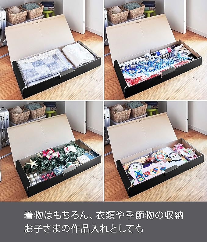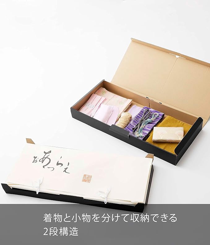 着物も小物もまとめて収納。湿気にも強い丈夫な着物収納ケース。着物と小物類を分けて収納できます。仕切りは簡単に引き上げられます。取り出しやすい取っ手付き。シンプルなデザインは和室にも馴染みます。大容量なので圧縮した衣類などをまとめて収納。大切な想い出を整理しながら保管。鯉のぼりやクリスマスツリー等の長物も収納できます。通気性が良い紙製なので大きな季節物の収納にも。