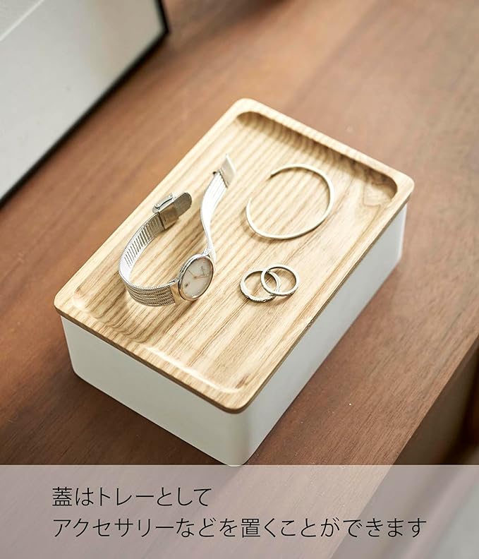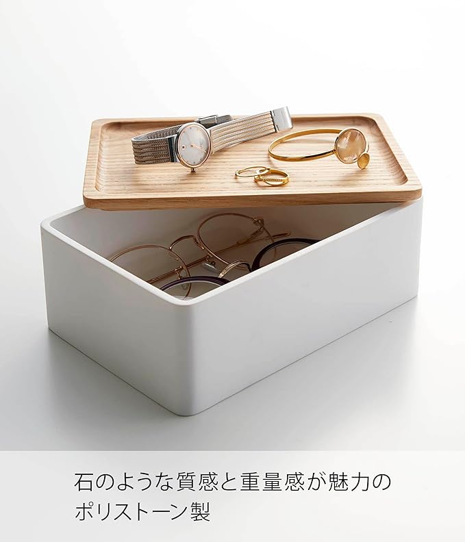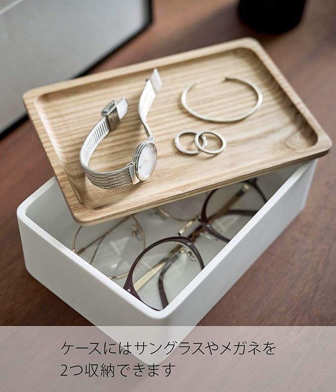 サングラスやメガネ、アクセサリーを収納できる蓋付きケース。蓋はトレーとしてアクセサリーなどを置くことができます。容器にはサングラスやメガネを2個収納可能。蓋はトレーになっているので普段使いの時計やアクセサリーなどを収納していただけます。