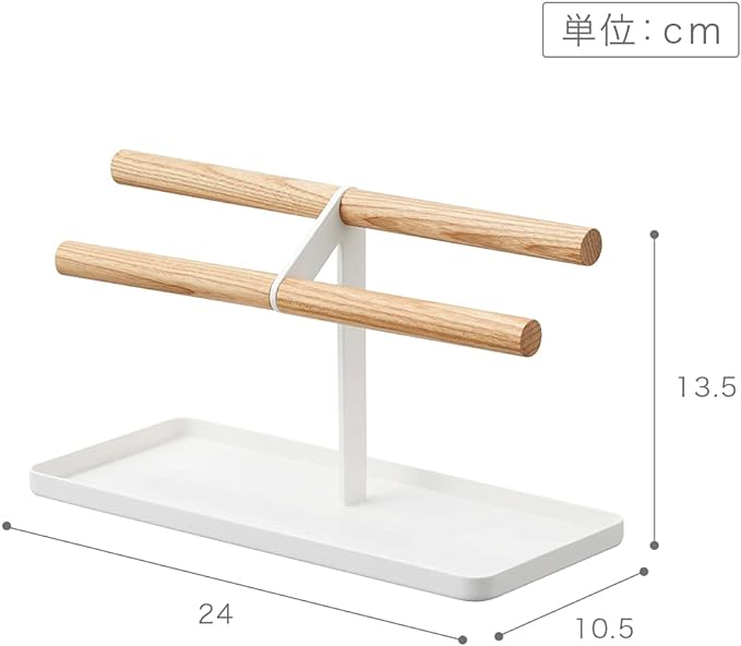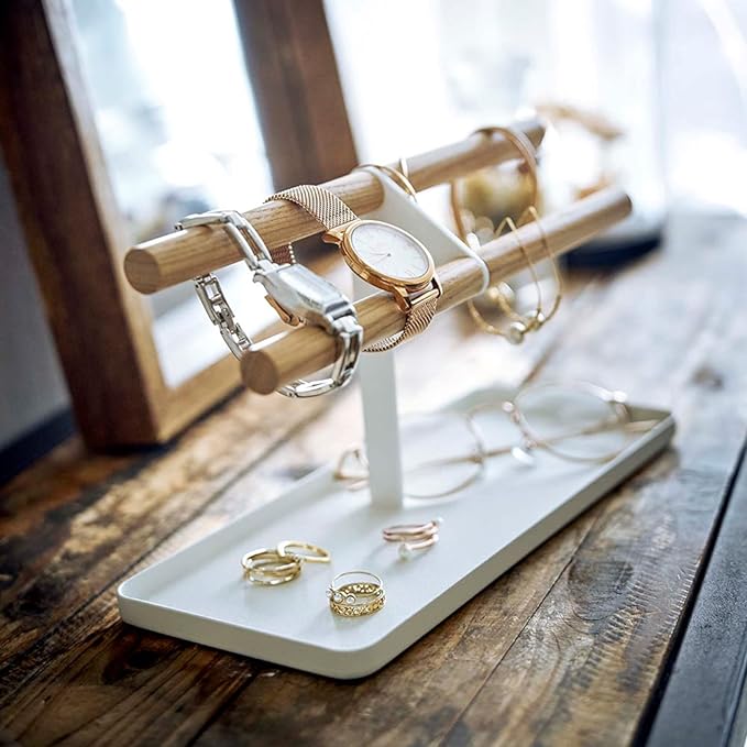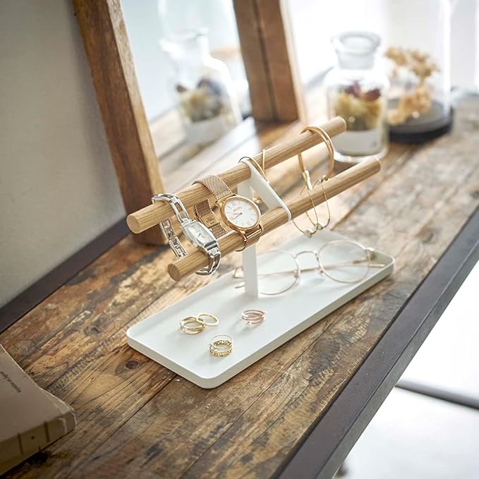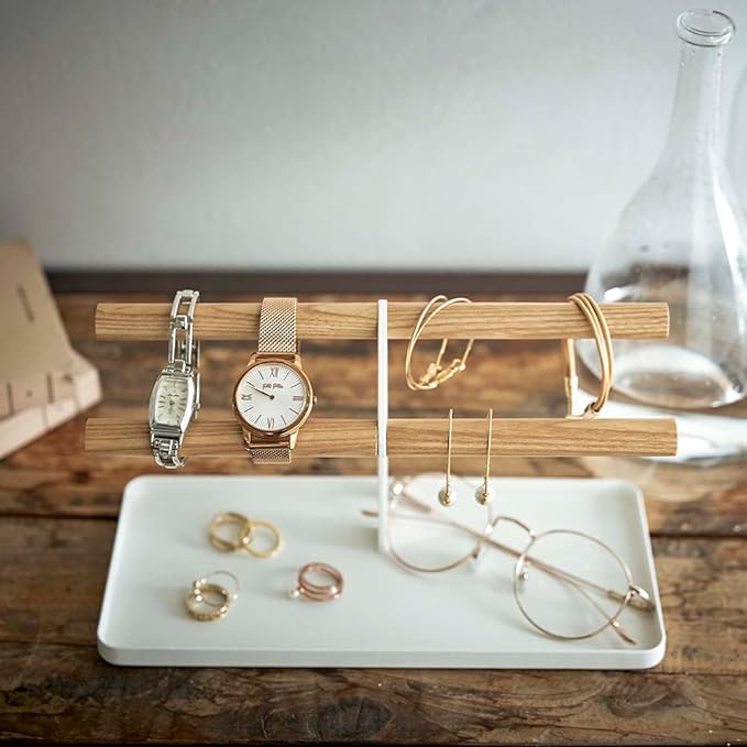時計やブレスレットをディスプレイするように収納出来るトレー付きスタンド。バー2本に通すように収納すれば時計やブレスレットを飾るように収納できます。フックタイプやフープタイプのピアスの引っ掛け収納にも便利。下のトレーにはメガネや指輪などを置いて収納することができます。