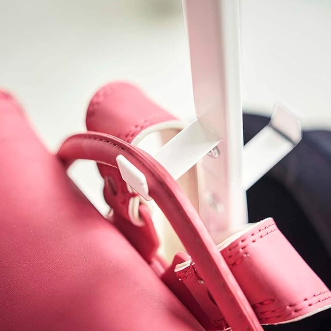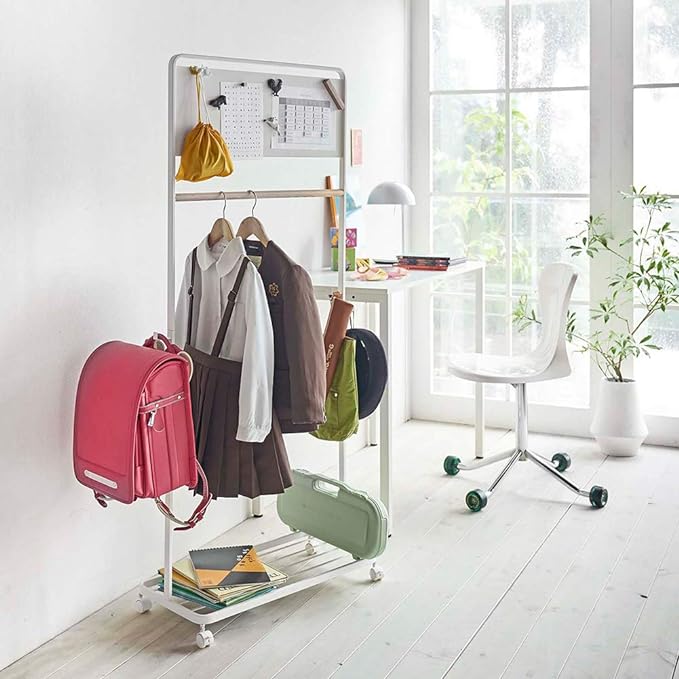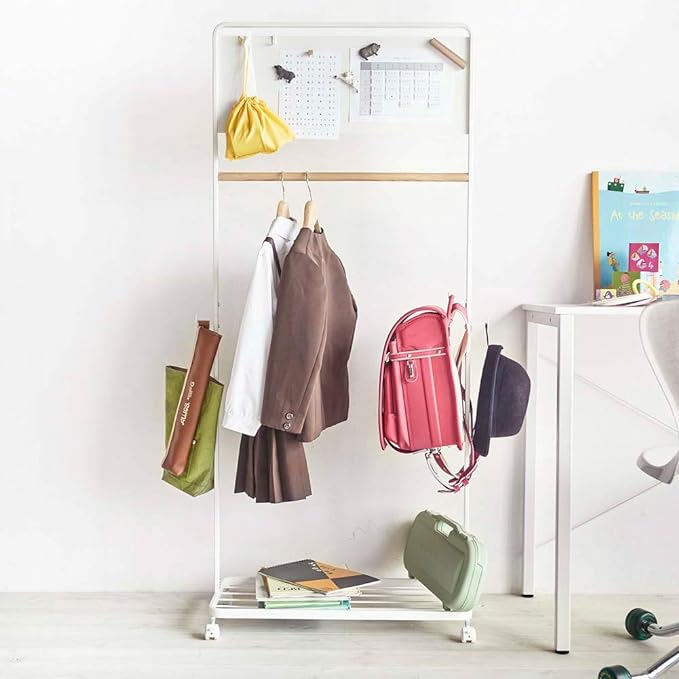ランドセル、制服、時間割り。必要なものを揃えて収納できるハンガーラック。付属のフックで小物類を掛けられます。パネルには時間割やメモなどを貼り付けられます。左右に3つ大きなフックがあり、ランドセルやお稽古バッグなどを収納できます。台座は大きめのラックになっているので掛けられない荷物を収納できます。