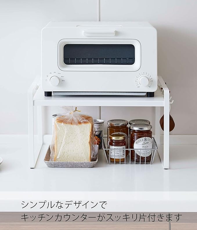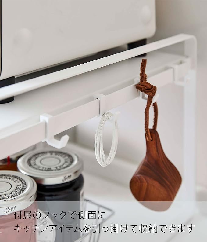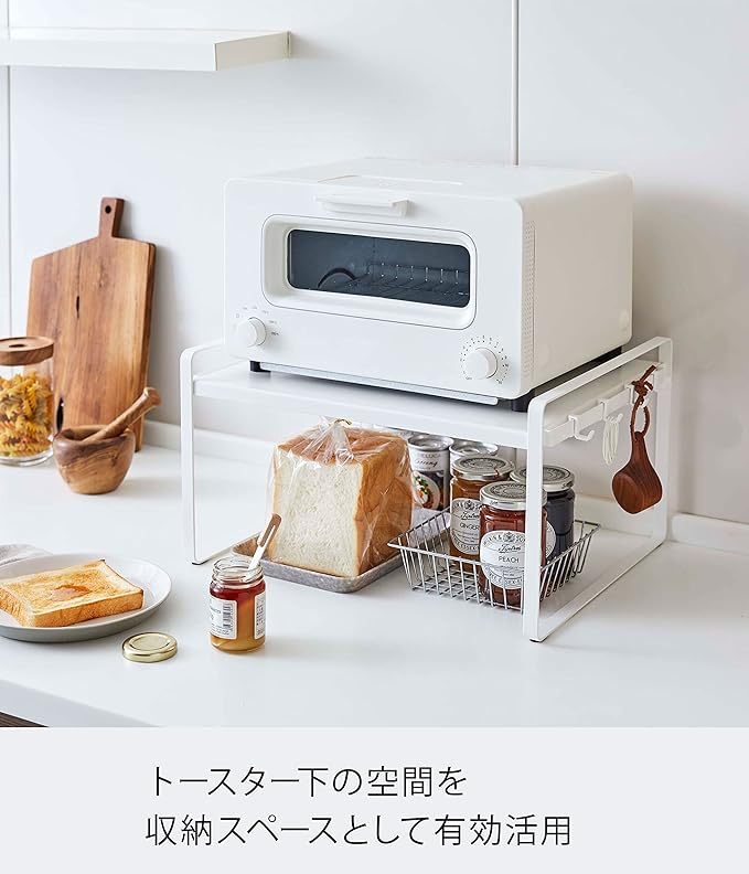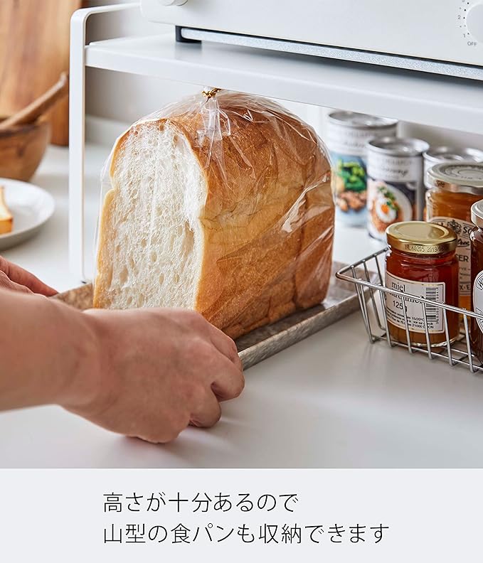 トースター下の空間を収納スペースとして有効活用。食パンやキッチンストックを収納できる便利なラック。下の空間を収納スペースとして空けておき、お皿やバットなどの一時置きスペースとしても便利。付属のフックを使えば側面にキッチンアイテムを引っ掛けて収納することができます。下の空間を収納スペースとして使えます。高さが十分あるので山型の食パンも収納できます。便利なフック付き。