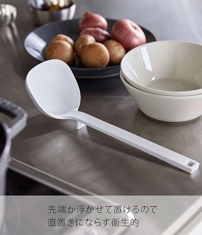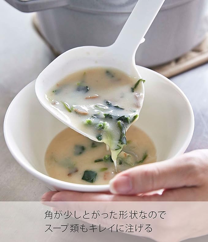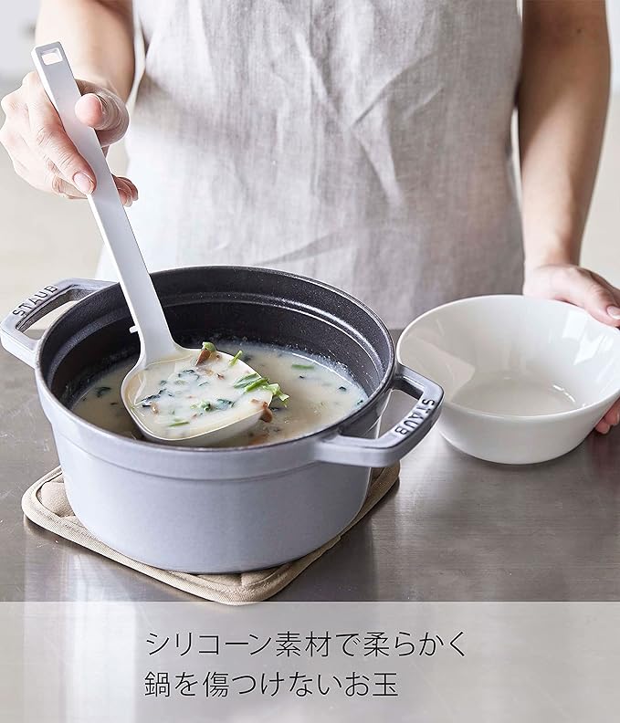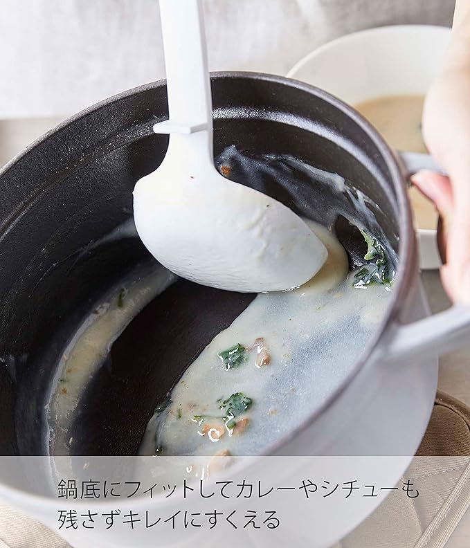 シリコーンコーティングのキッチンツールシリーズ。シリコーン製で滑りにくく、熱に強く、弾力性に優れ、ボウル・ナベ・フライパンなどを傷つけません。また、先端が浮くので直置きにならず清潔。鍋にフィットして、カレーやシチューなども残さずきれいにすくえます。軽量で使い勝手のいいキッチンツール。
