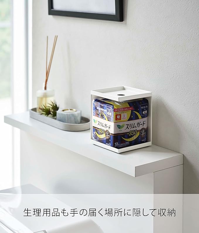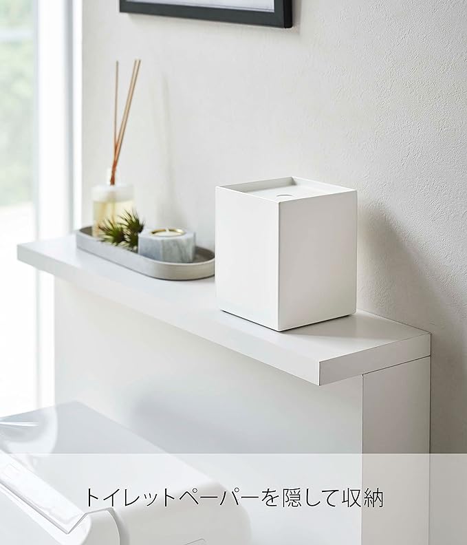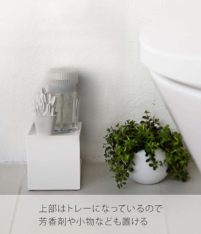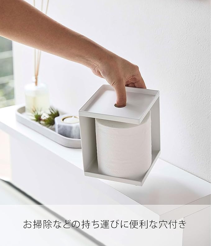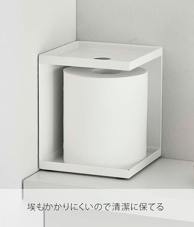 トイレットペーパーをコーナーに隠して収納。コーナーに置けば存在を主張せず、空間に美しくなじみます。上はトレイになっているので、芳香剤や消臭スプレーを置くことができます。生理用品などを隠して収納することも可能。お掃除などの持ち運びに便利な穴付き。