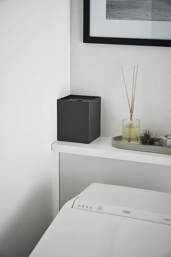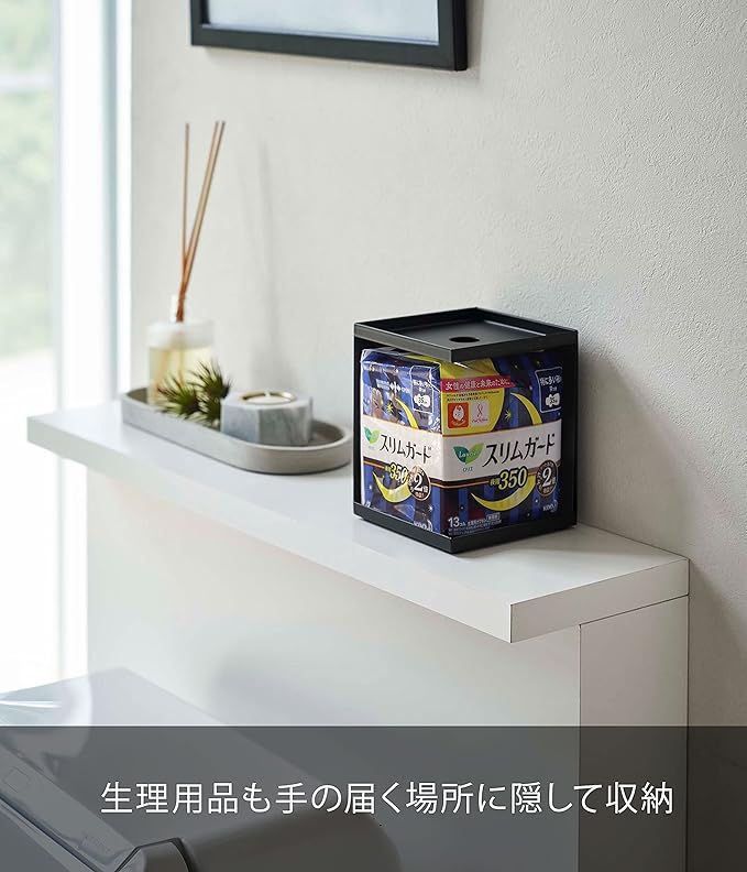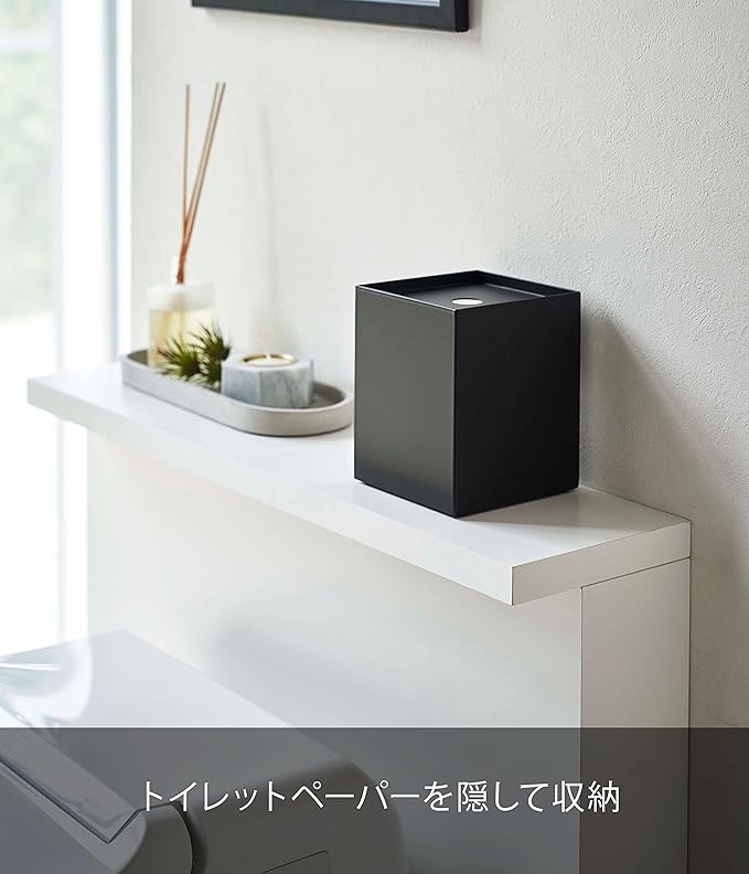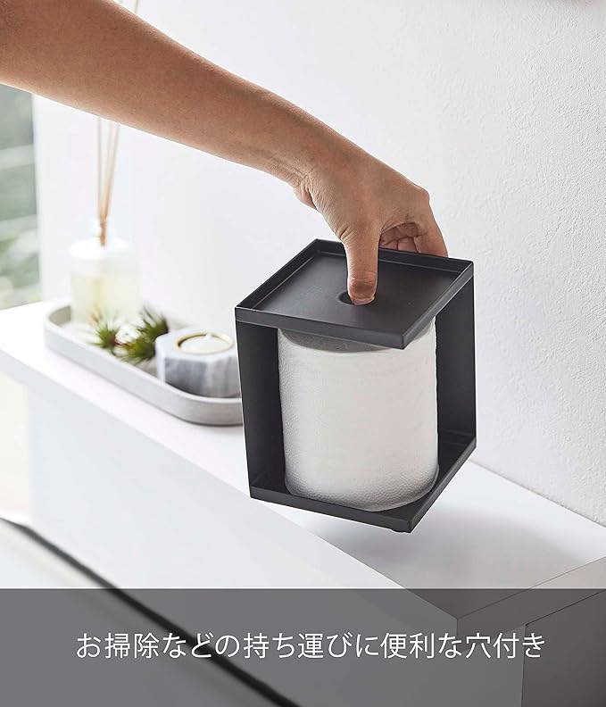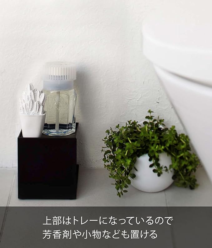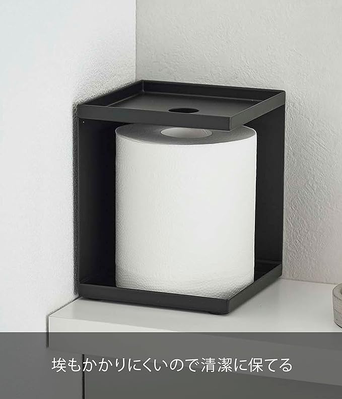 トイレットペーパーをコーナーに隠して収納。コーナーに置けば存在を主張せず、空間に美しくなじみます。上はトレイになっているので、芳香剤や消臭スプレーを置くことができます。生理用品などを隠して収納することも可能。お掃除などの持ち運びに便利な穴付き。