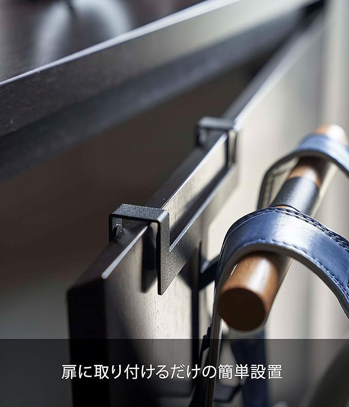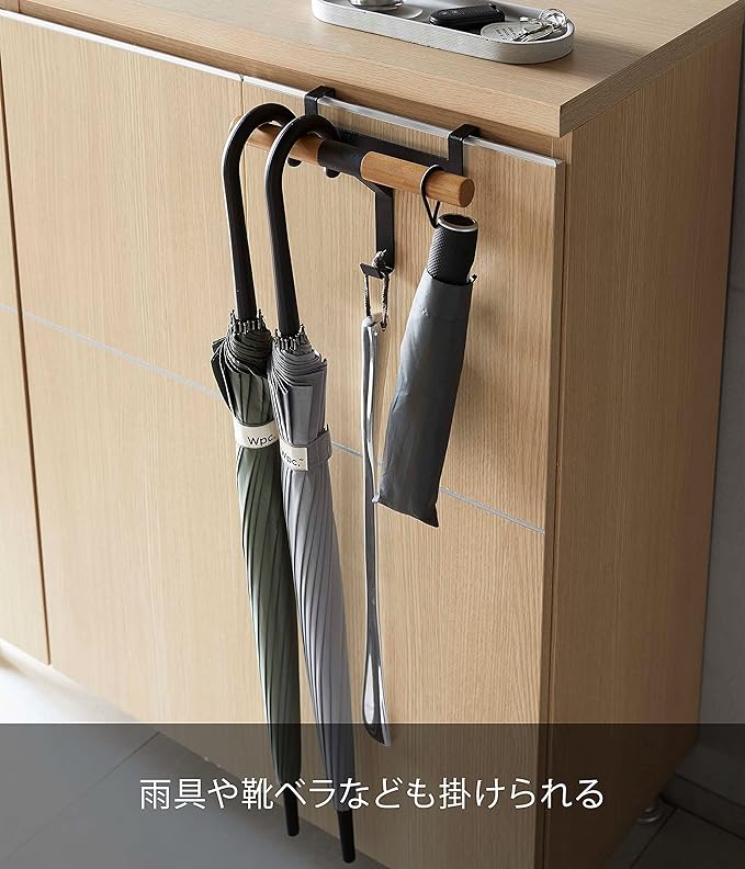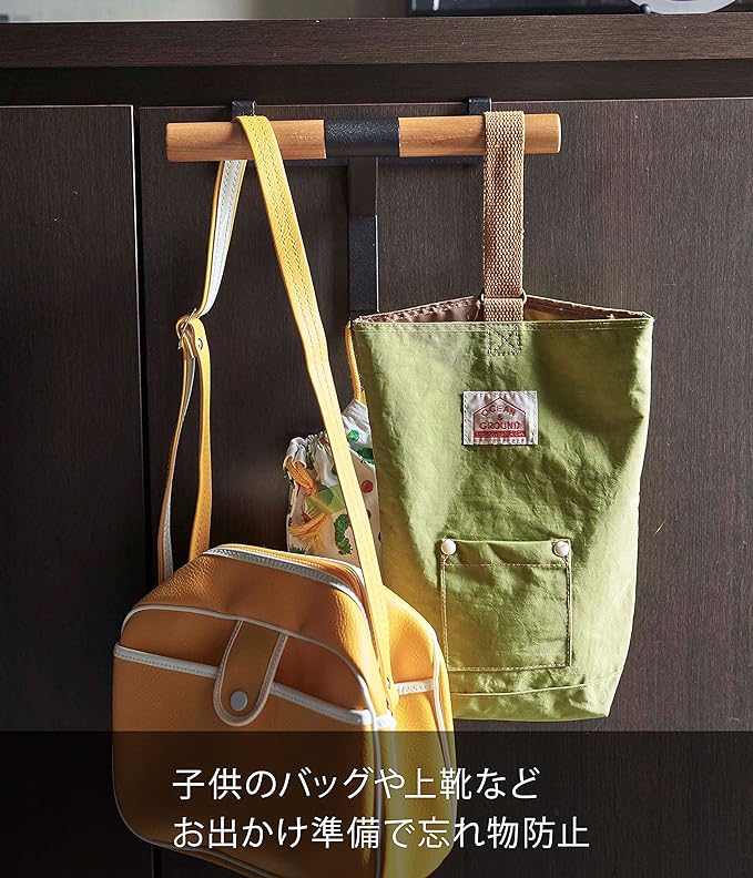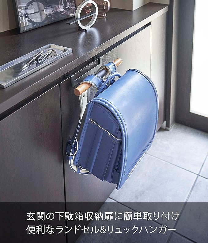 玄関の下駄箱収納扉に簡単取付け。天然木を使った便利なランドセル&リュックハンガー。用途に合わせて使い方自在。下駄箱扉に差し込むだけの簡単取付。丈夫なハンガー部分だからリュックサックやランドセルをしっかり掛けられます。