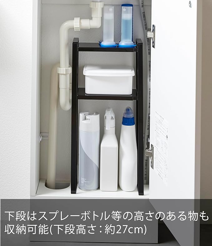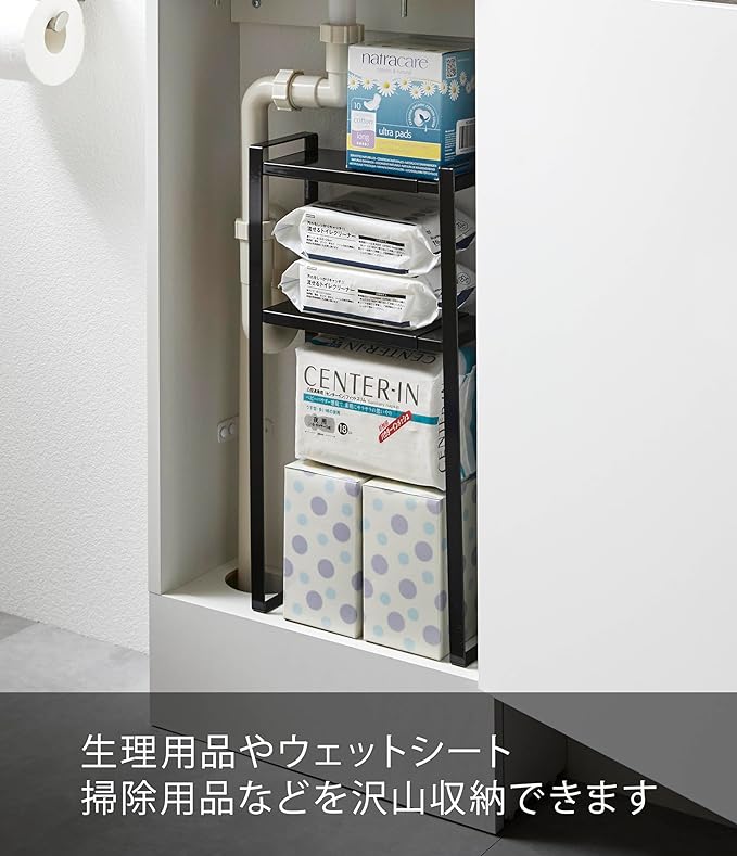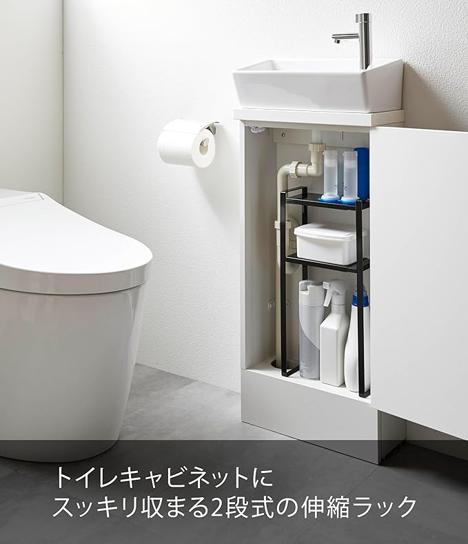 トイレキャビネットにスッキリ収まる伸縮ラック。キャビネット内の配管下のスペースに置くだけの簡単設置。収納場所に困る小物や詰め替え袋などを一括収納。消臭スプレーやサニタリーバッグの替え袋など高さがあるものも収納可能。生理用品やウェットシートなどの替え、掃除用品などを2段に収納。
