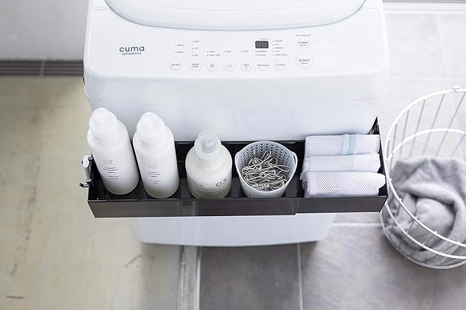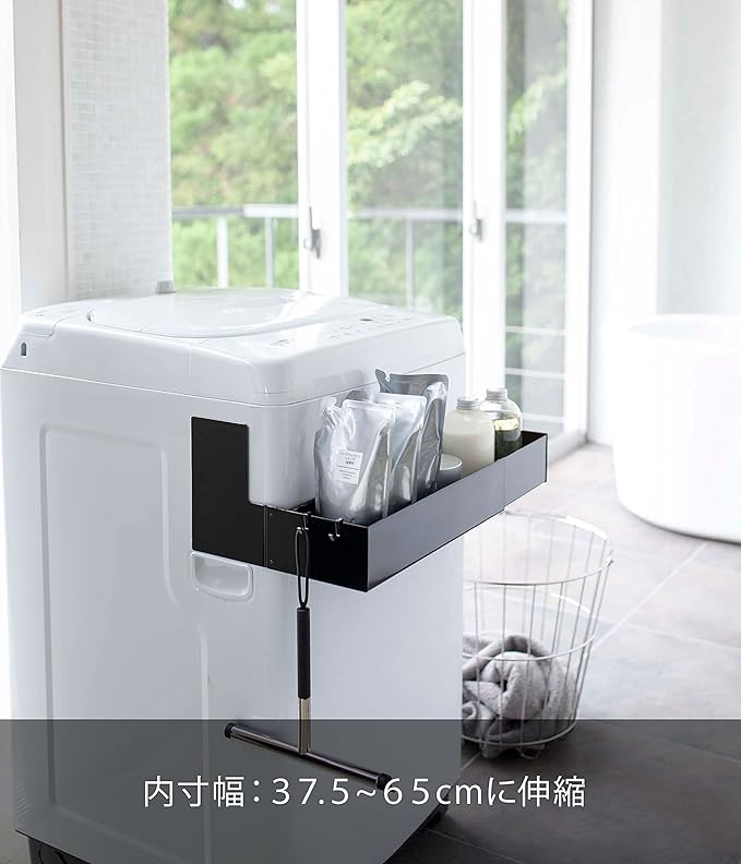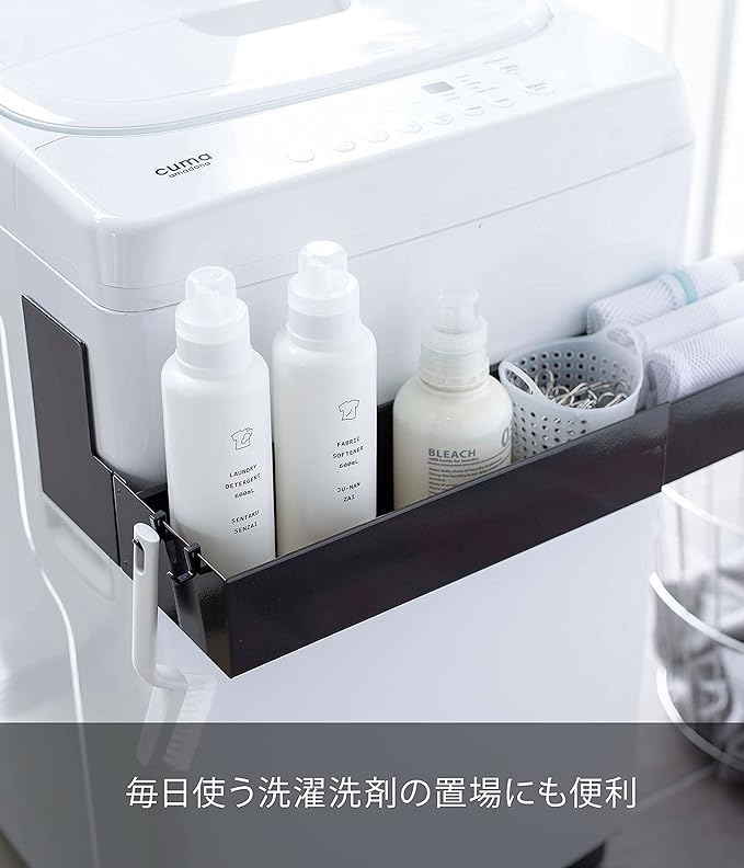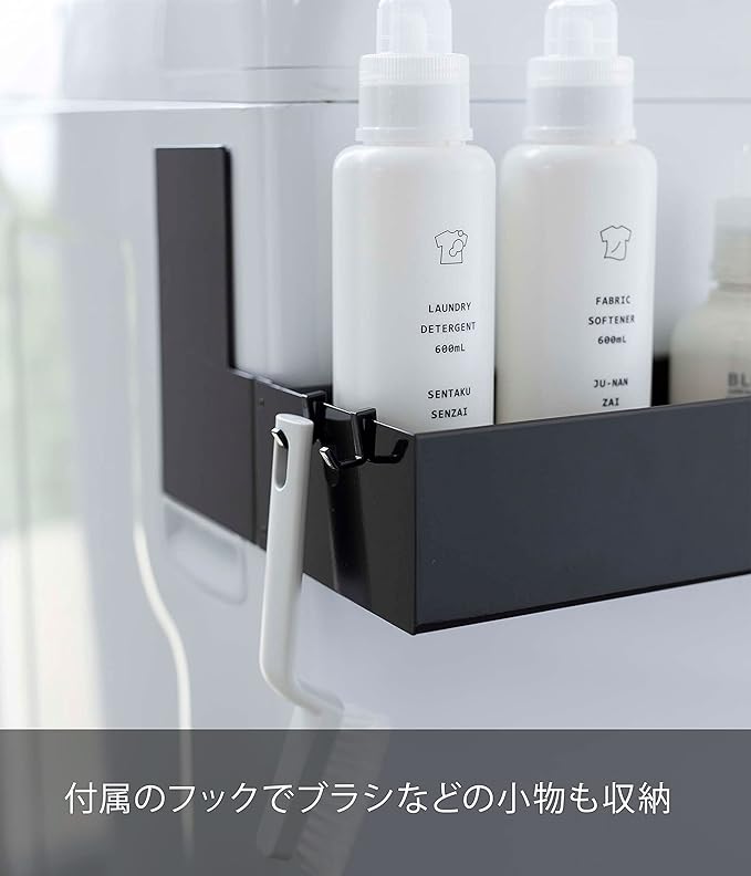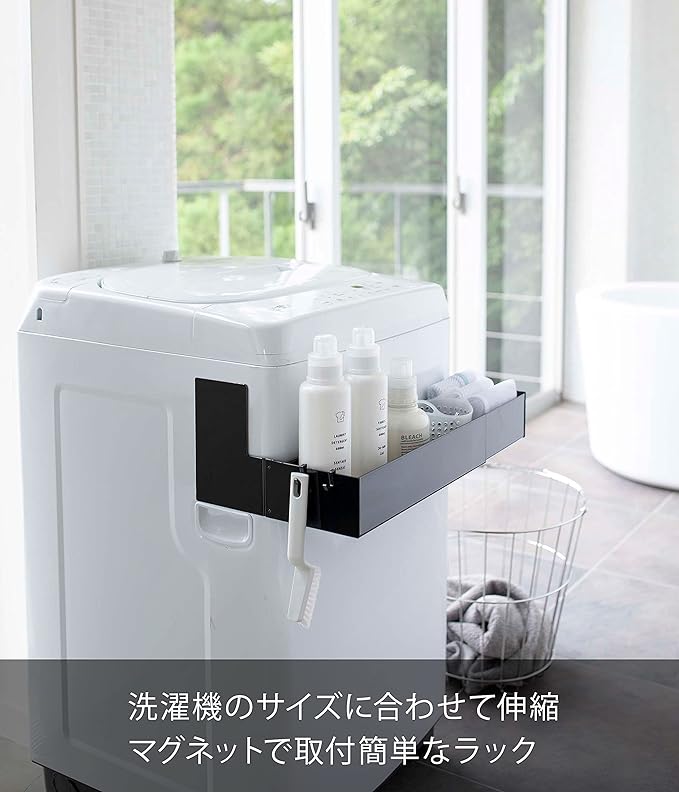 マグネットで洗濯機の側面から挟み込むだけの簡単取り付けラック。伸縮できるから洗濯機のサイズに合わせて調整できます。2個同時に使用すれば収納力もUP。付属のフックでブラシなどの小物も収納可能。洗剤ボトルや洗濯ネットなどを洗濯機の手前に収納できるから洗濯作業がスムーズ。シャンプー・コンディショナーなどのバス用品のストックの収納としても便利。