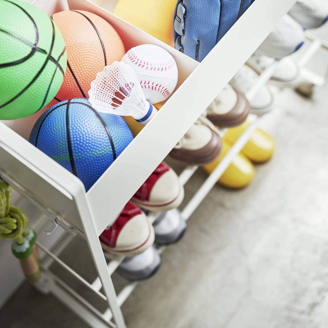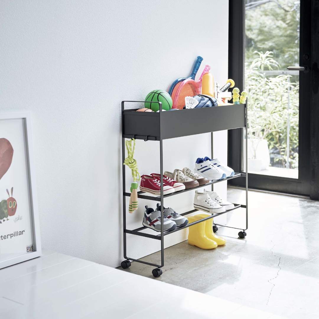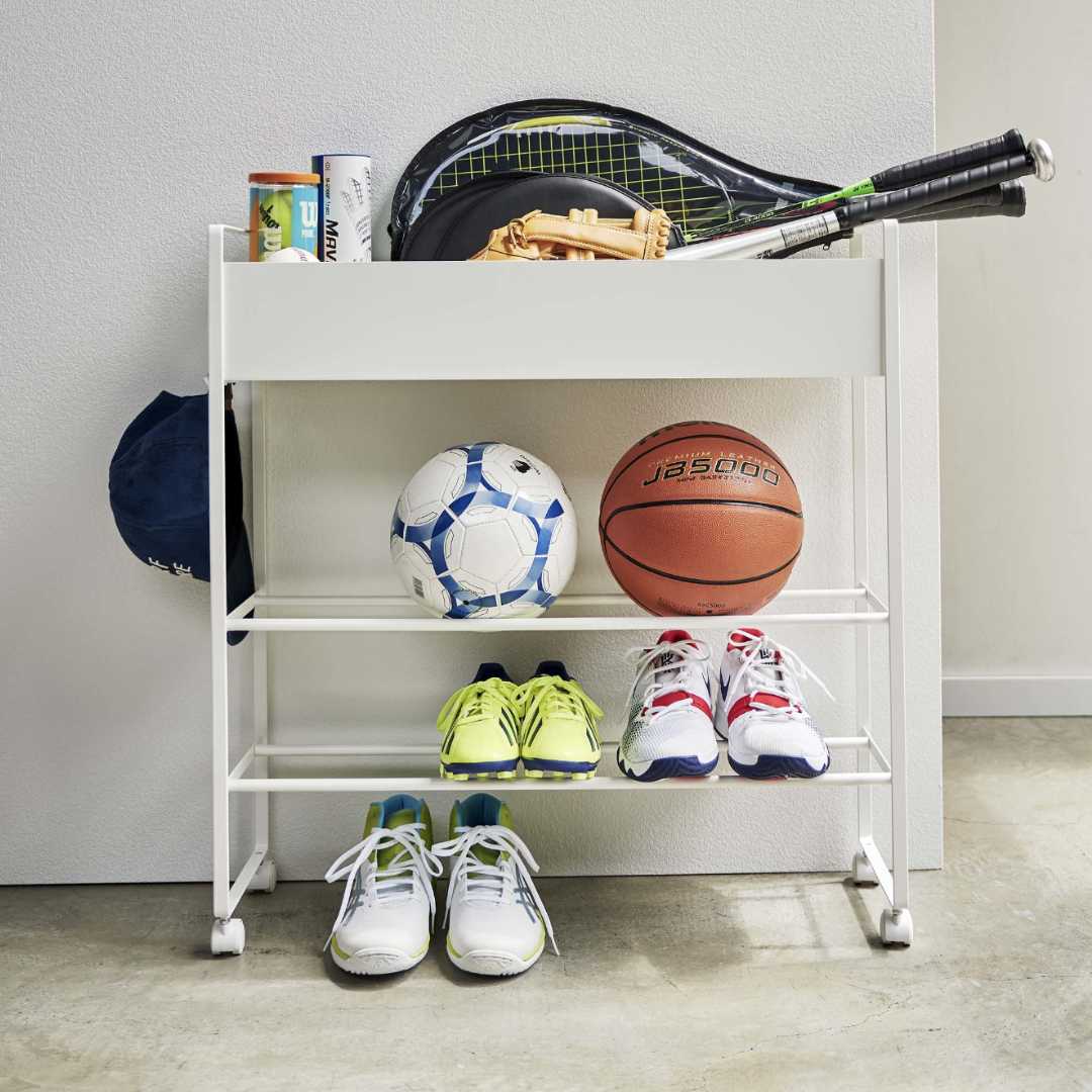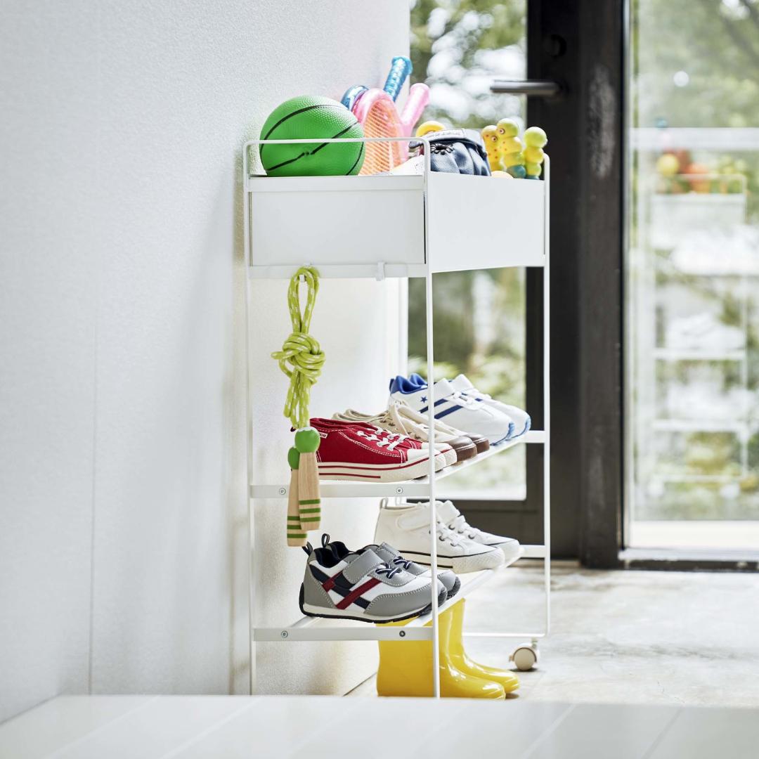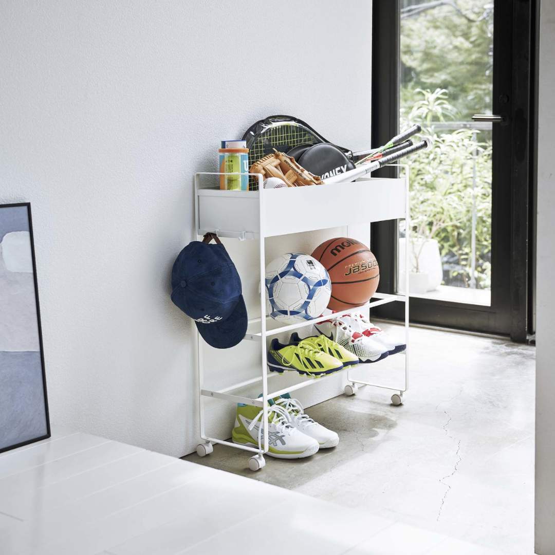 玄関に散らかる靴やおもちゃをすっきり収納。キャスター付きの便利な収納ラック家族の靴や子どもの外遊び用のおもちゃなどをまとめてすっきりしまえる、キャスター付きの収納ラック。最上段はバスケットタイプになっているので、テニスラケットなどのスポーツ用品や子どもの外遊びグッズなどをしまっておくのにぴったりです。可動式の仕切り板付きだから、細々したアイテムも整理整頓しやすくて◎。下2段には、置き場所に困るボールやスポーツ用シューズなどを収納できます。小さな子どもから大人まで、家族みんなで使えるのがとっても便利。フックが付属しているので、なわとびや帽子などを引っ掛けて収納しておくこともできます。キャスター付きで簡単に移動できるから、玄関掃除がラクにできるのもうれしいポイント。カラーバリエーションはホワイト・ブラックの2種類カラーバリエーションは、明るい印象のホワイトとスタイリッシュなブラックの2色。どちらもインテリアになじみやすい定番カラーなので、玄関の雰囲気や好みに合わせて選んでみてください。