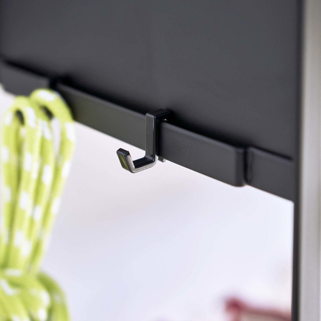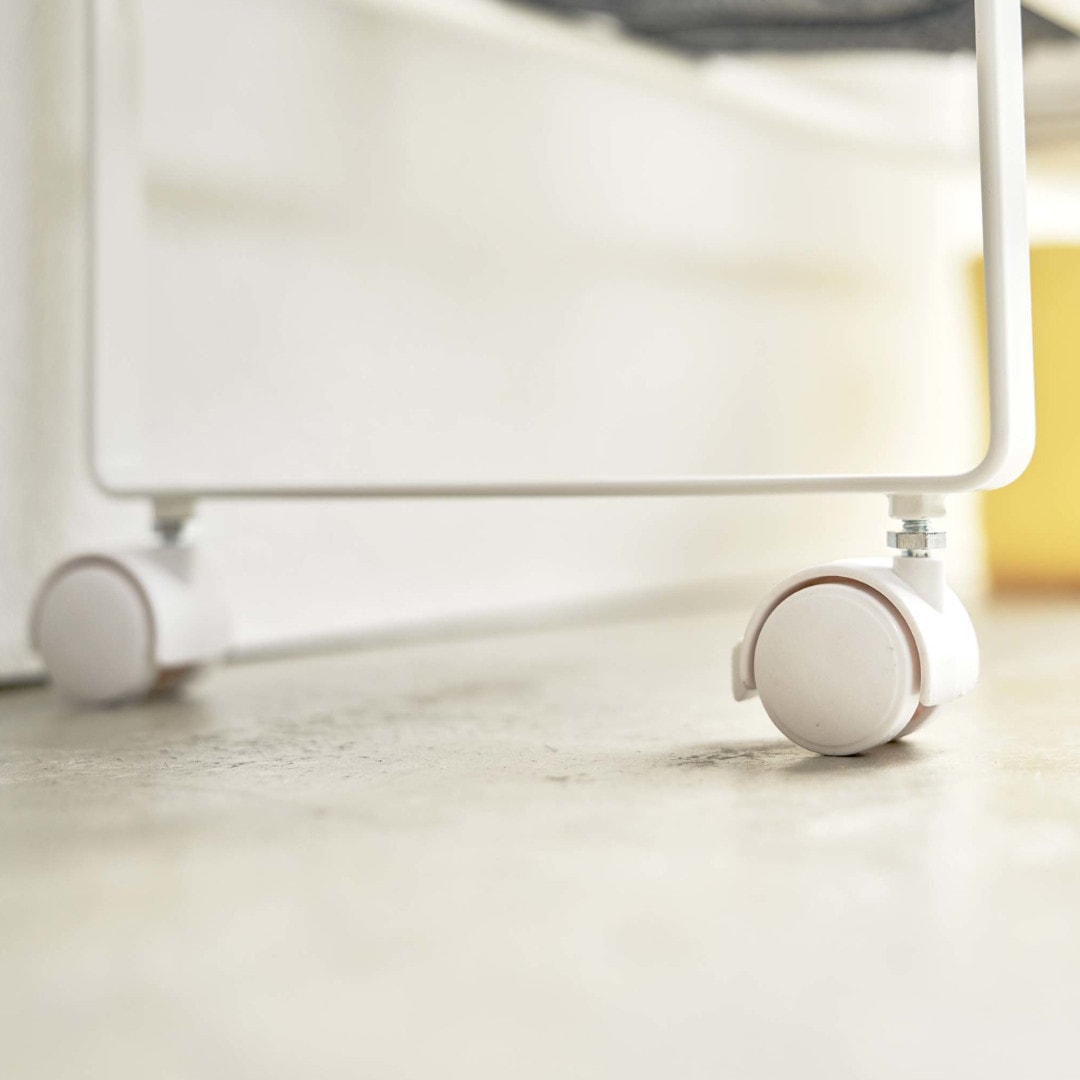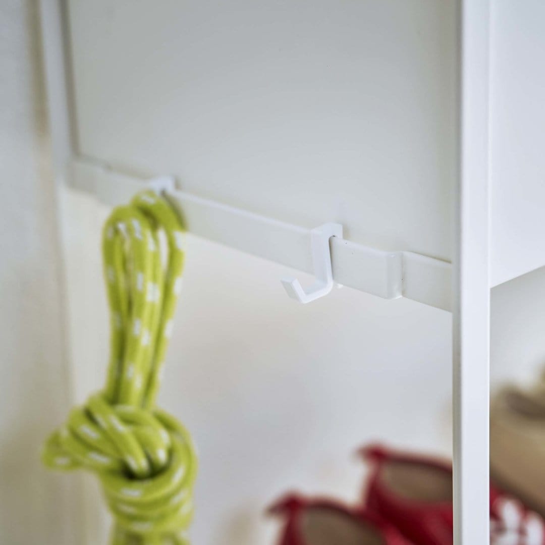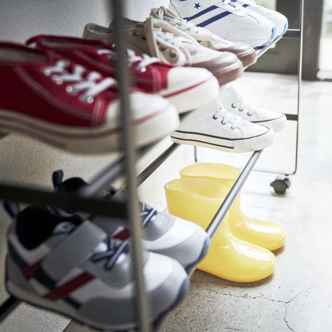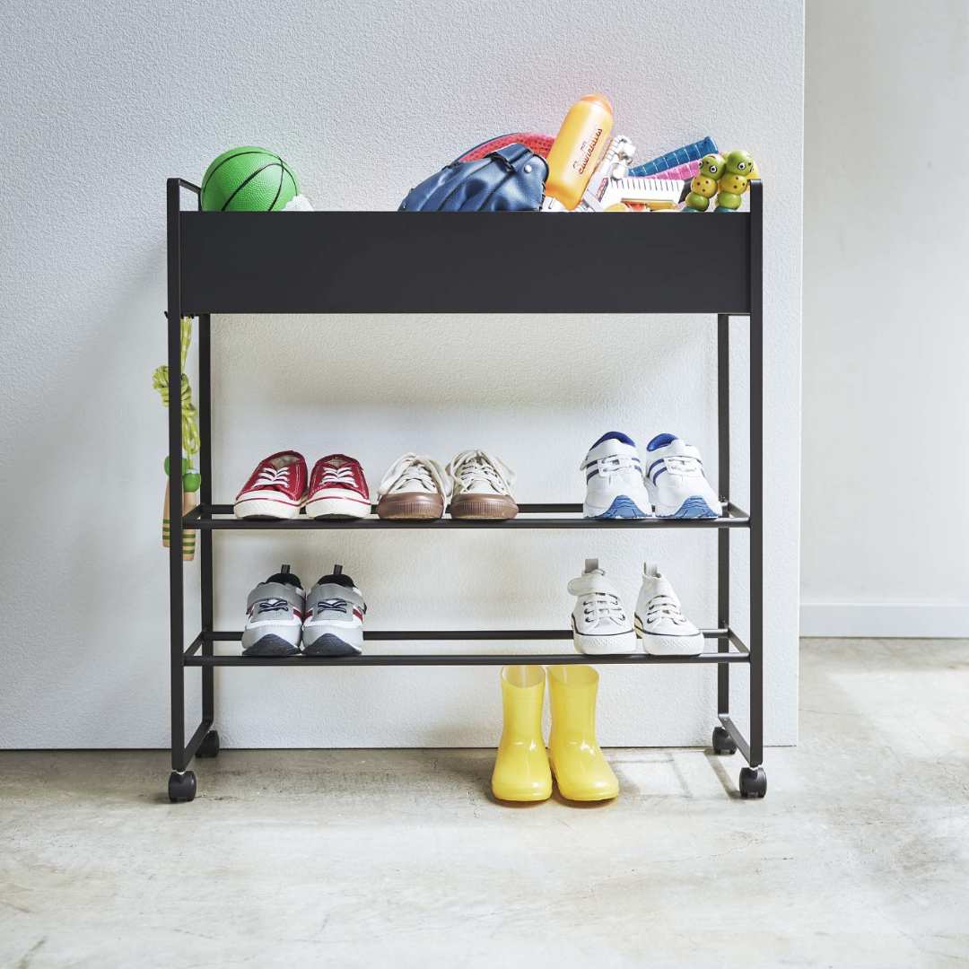 玄関に散らかる靴やおもちゃをすっきり収納。キャスター付きの便利な収納ラック家族の靴や子どもの外遊び用のおもちゃなどをまとめてすっきりしまえる、キャスター付きの収納ラック。最上段はバスケットタイプになっているので、テニスラケットなどのスポーツ用品や子どもの外遊びグッズなどをしまっておくのにぴったりです。可動式の仕切り板付きだから、細々したアイテムも整理整頓しやすくて◎。下2段には、置き場所に困るボールやスポーツ用シューズなどを収納できます。小さな子どもから大人まで、家族みんなで使えるのがとっても便利。フックが付属しているので、なわとびや帽子などを引っ掛けて収納しておくこともできます。キャスター付きで簡単に移動できるから、玄関掃除がラクにできるのもうれしいポイント。カラーバリエーションはホワイト・ブラックの2種類カラーバリエーションは、明るい印象のホワイトとスタイリッシュなブラックの2色。どちらもインテリアになじみやすい定番カラーなので、玄関の雰囲気や好みに合わせて選んでみてください。
