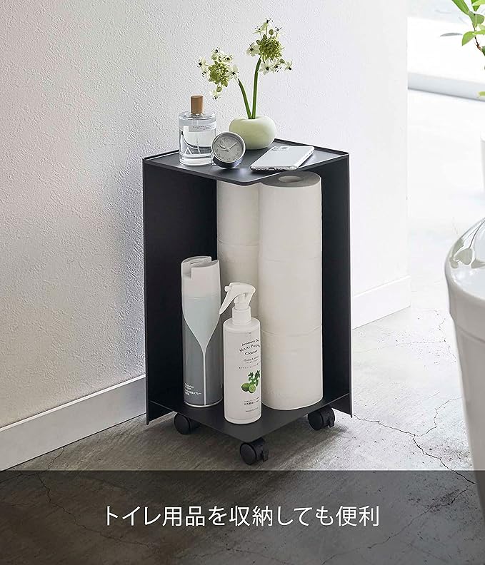 トイレットペーパーを袋ごと隠して収納できるトイレットペーパーストッカー。キャスター付きだからトイレットペーパーの補充やそうじの際の移動も簡単。最大12ロールのトイレットペーパーに対応。消臭スプレー等の備品もまとめて収納。天板はスマートフォンの一時置きにも便利。