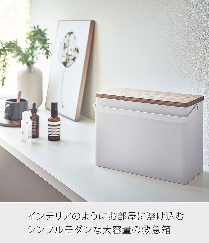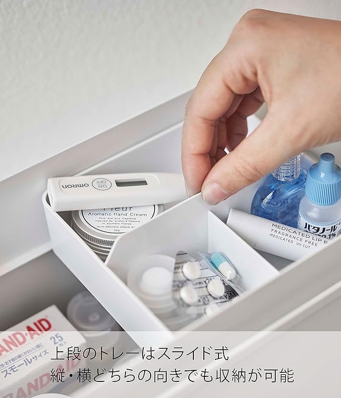 毎日の暮らしにちょうどいい。モダンでスタイリッシュな大容量の救急箱。上段のトレーはスライド式。縦・横どちらの向きでも収納できます。持ち運びに便利な取っ手付き。トレーは取り出すことができるので、卓上で道具類を散らかさずに一時置きできます。出しておいても生活感のでないデザイン。高さがあるので消毒液のボトル類も収納できます。木蓋を裏返せばトレーとしてご使用いただけます。