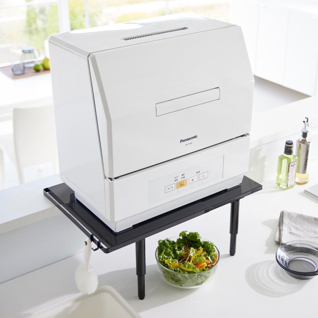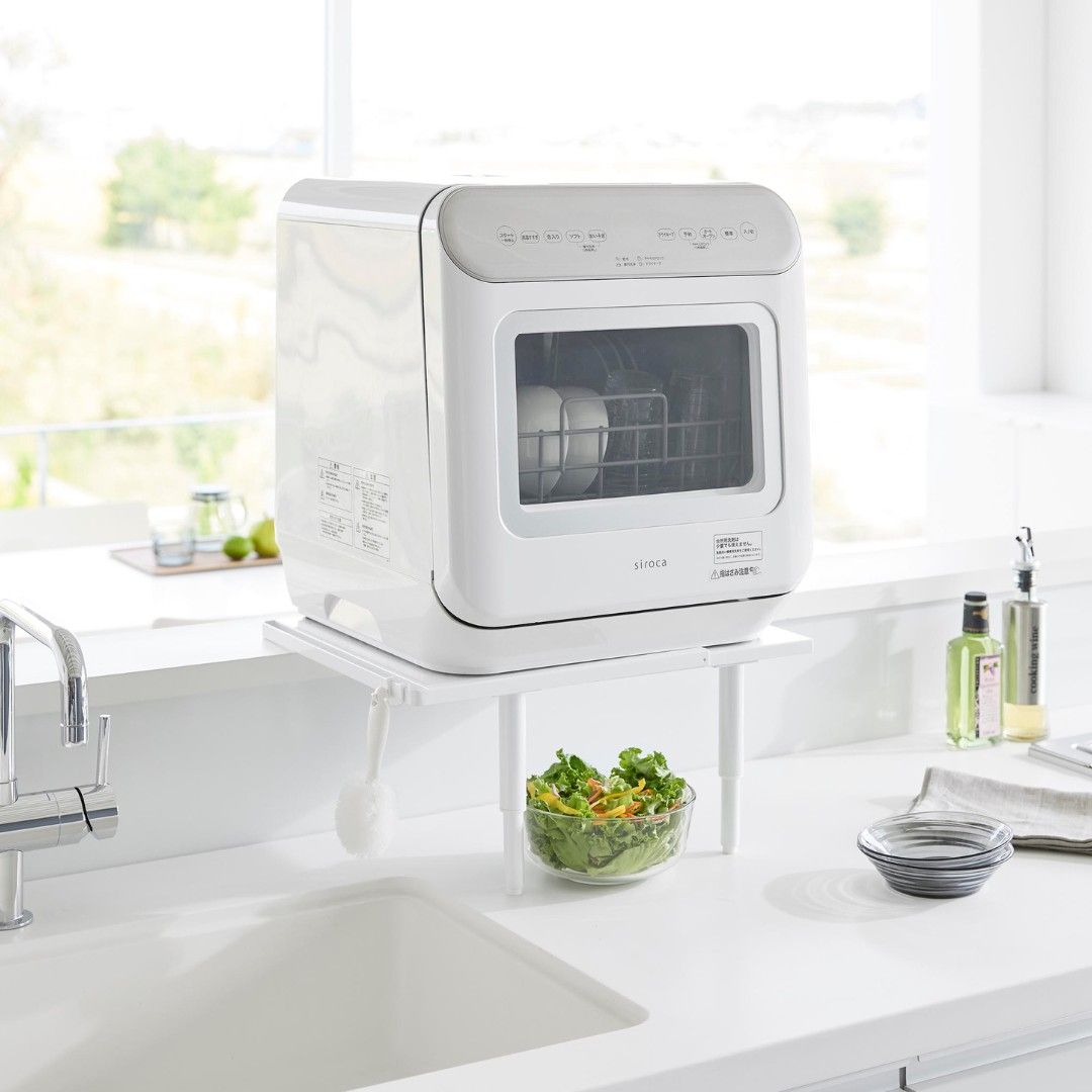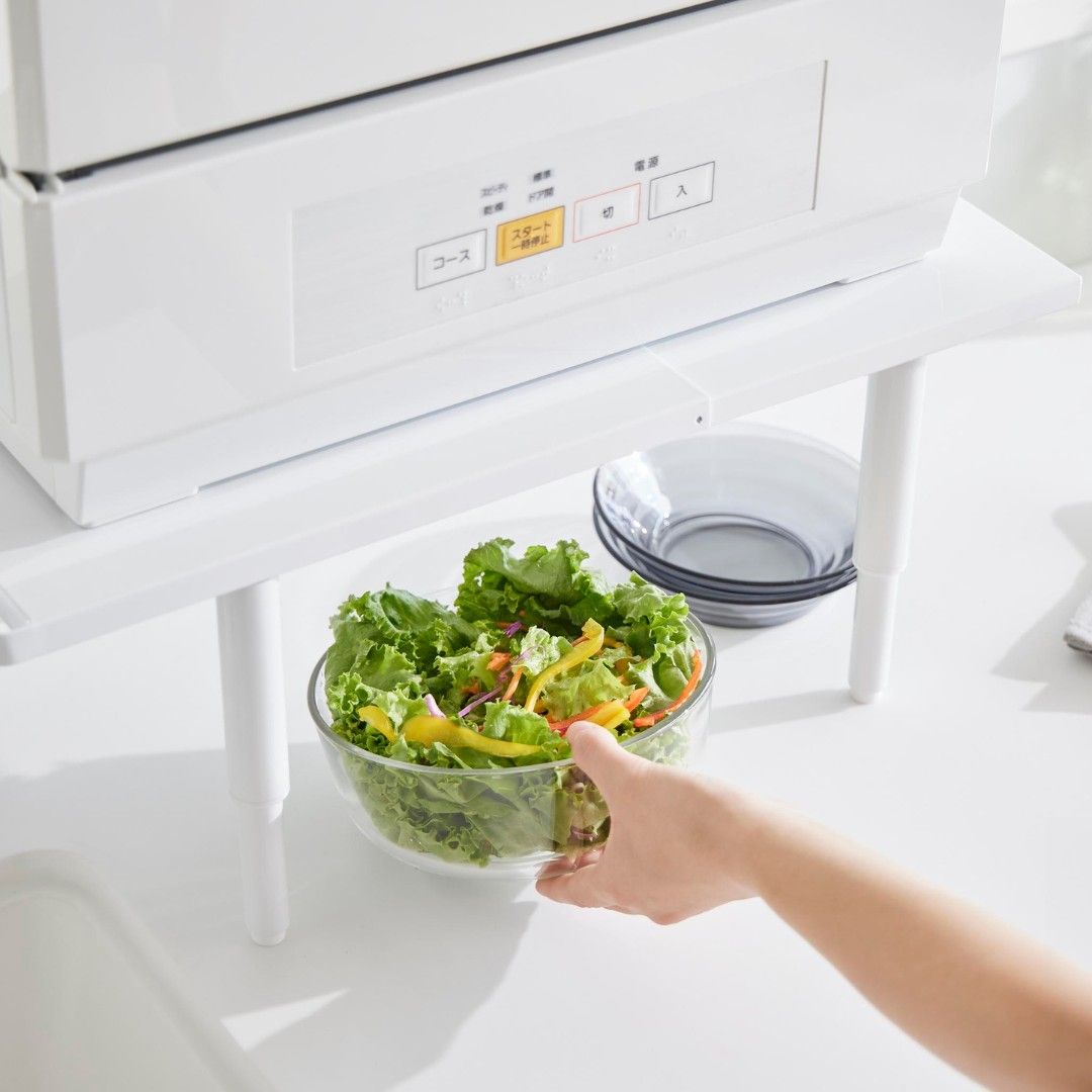 キッチンカウンターの幅を広げて、食洗機を置けるラックキッチンカウンターに食洗機の後ろ半分を載せられるので、省スペースに設置することができる食洗機ラック(高さ13.8~22.3cmのハイタイプ)。脚の高さ・脚の間隔・天板の幅も調整ができるので、キッチンや食洗機に合わせて調整ができる点もグッド。ラック下にスペースができるから、作業スペースとして広々使え、お掃除もラクチンです。※高さ9.8~13.8cmの「ロータイプ」は別ページにてご用意しております。キッチンに馴染む、2色のカラーバリエーションカラーは、ホワイト・ブラックの2色。シンプルでスタイリッシュなデザインかつ、どんなキッチンでも馴染みやすいモノトーンカラーです。キッチン・食洗機に合わせて調節可能キッチンカウンターに合わせて脚の高さが調節が可能です。また、設置場所に合わせて脚の間隔も3段階から選べます。天板の幅が伸縮できるので 様々なサイズの食洗機にも対応しています。浮かせることで、作業スペースもしっかり確保脚の高さを調節したら、ラック下のスペース誕生。盛り付け前のお皿を並べたりして、作業スペースとして広々使えます。高さがあるからお掃除もラクラク。小物だってかけられる小物を掛けておくのに便利なフックが付属しています。洗い物で使うゴム手袋やブラシをかけておいたり、他のキッチングッズをかけて収納するのもいいですね。