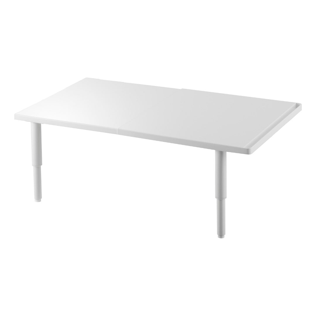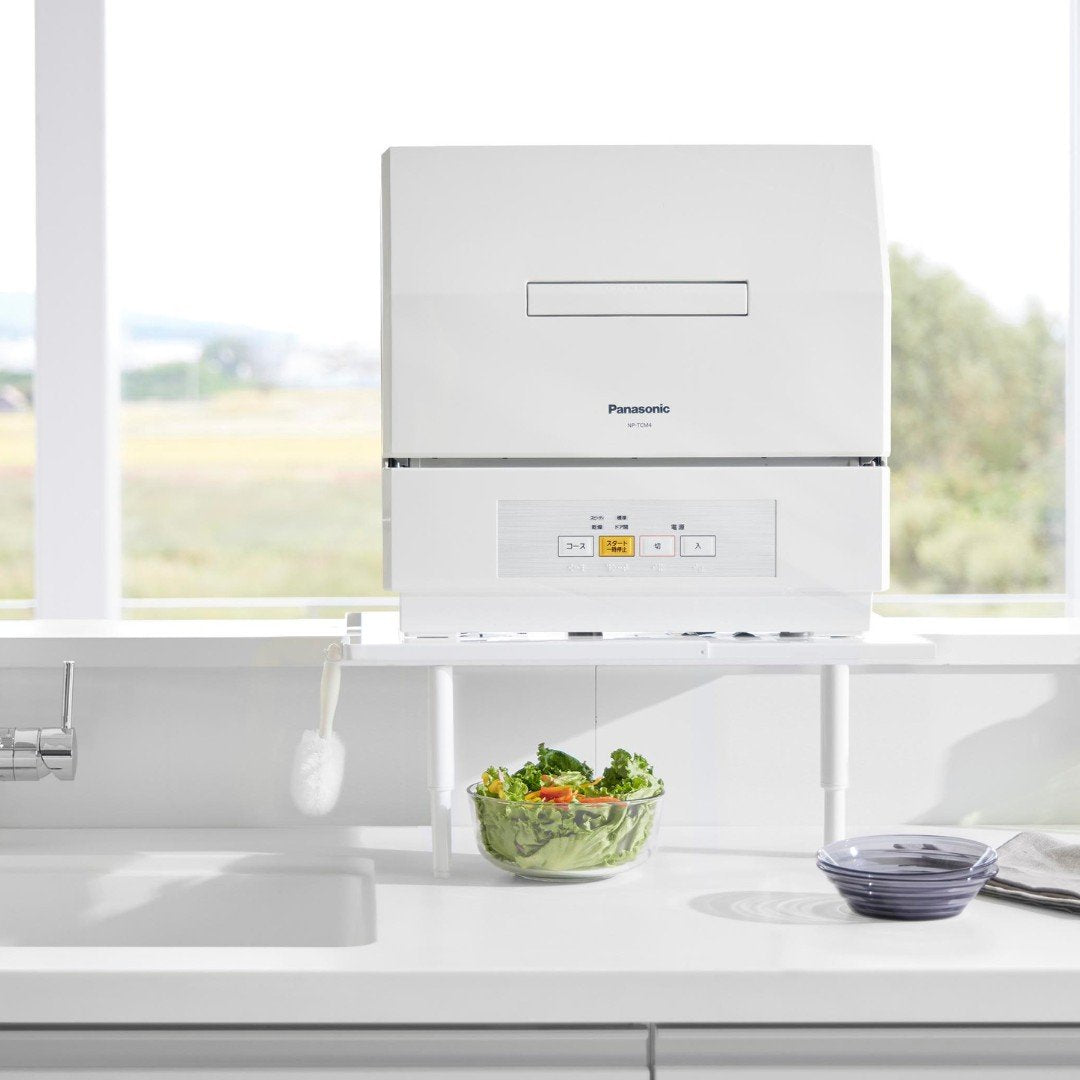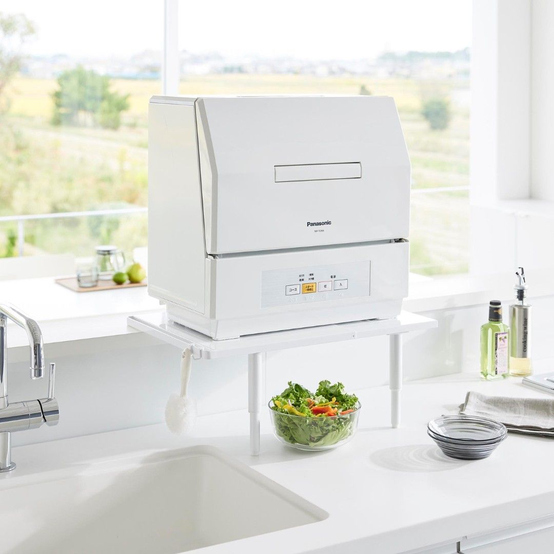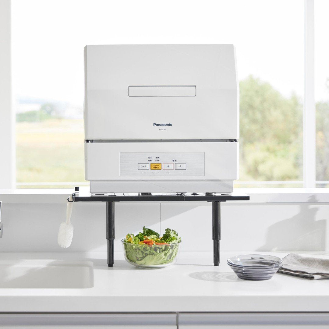 キッチンカウンターの幅を広げて、食洗機を置けるラックキッチンカウンターに食洗機の後ろ半分を載せられるので、省スペースに設置することができる食洗機ラック(高さ13.8~22.3cmのハイタイプ)。脚の高さ・脚の間隔・天板の幅も調整ができるので、キッチンや食洗機に合わせて調整ができる点もグッド。ラック下にスペースができるから、作業スペースとして広々使え、お掃除もラクチンです。※高さ9.8~13.8cmの「ロータイプ」は別ページにてご用意しております。キッチンに馴染む、2色のカラーバリエーションカラーは、ホワイト・ブラックの2色。シンプルでスタイリッシュなデザインかつ、どんなキッチンでも馴染みやすいモノトーンカラーです。キッチン・食洗機に合わせて調節可能キッチンカウンターに合わせて脚の高さが調節が可能です。また、設置場所に合わせて脚の間隔も3段階から選べます。天板の幅が伸縮できるので 様々なサイズの食洗機にも対応しています。浮かせることで、作業スペースもしっかり確保脚の高さを調節したら、ラック下のスペース誕生。盛り付け前のお皿を並べたりして、作業スペースとして広々使えます。高さがあるからお掃除もラクラク。小物だってかけられる小物を掛けておくのに便利なフックが付属しています。洗い物で使うゴム手袋やブラシをかけておいたり、他のキッチングッズをかけて収納するのもいいですね。