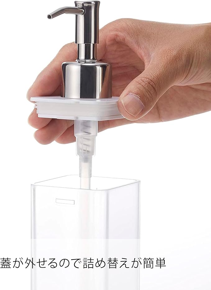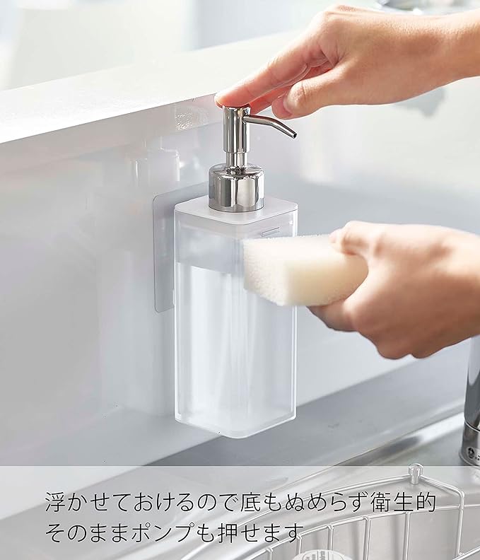 フィルムフックで壁面に浮かせて収納できるから衛生的。そのままポンプも押せます。洗面所のハンドディスペンサーとしても使えます。壁面のフックにかけるだけ。蓋が外れるので詰め替えが簡単。シンク中にも使えます。
