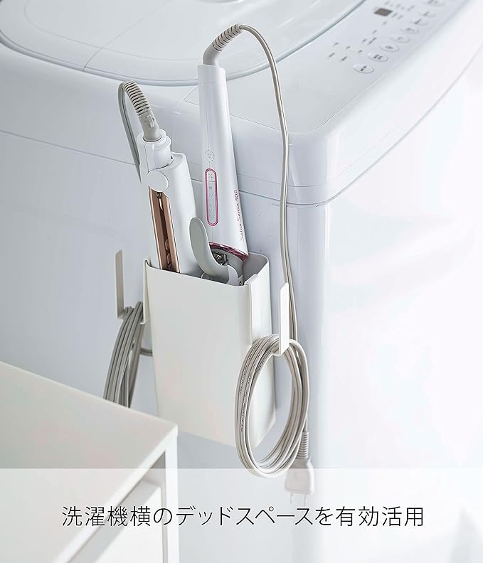 強力マグネットで置き場所に困る2本のヘアーアイロンやブラシを一括収納。強力マグネットで洗濯機に付けるだけ。簡単取付のヘアーアイロンホルダー。可動式の仕切りで2種類のヘアーアイロンを収納可能。コード収納ホルダー付きなので煩わしいコードもスッキリ収まります。便利なマグネット付きの仕切り。コード収納フックは本体に差し込むだけ。