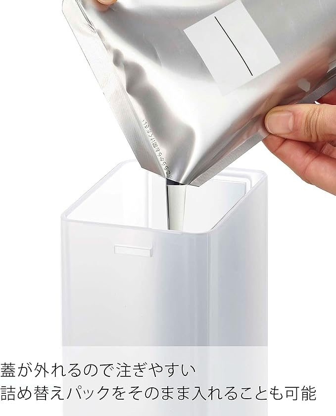 フィルムフックで壁面に浮かせて収納できるから、底がぬめらず衛生的。そのままポンプも押せます。壁面のフィルムフックにかけるだけ。蓋が外れるので、詰め替えが簡単。詰め替え用袋がそのまま入ります。蓋が外れるのでお手入れ簡単。