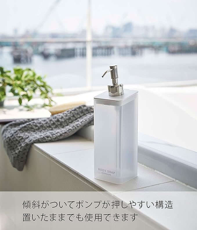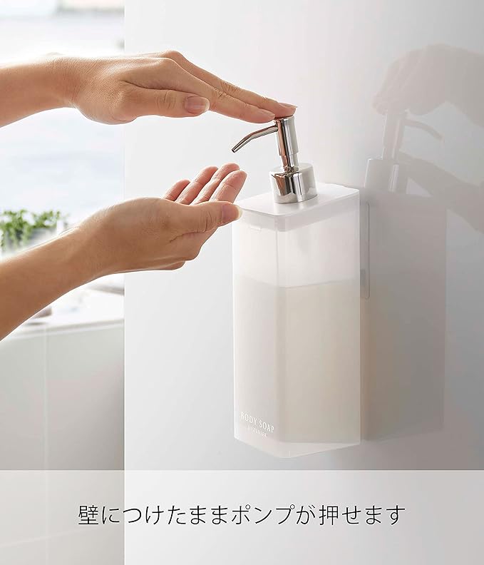フィルムフックで壁面に浮かせて収納できるから、底がぬめらず衛生的。そのままポンプも押せます。壁面のフィルムフックにかけるだけ。蓋が外れるので、詰め替えが簡単。詰め替え用袋がそのまま入ります。蓋が外れるのでお手入れ簡単。