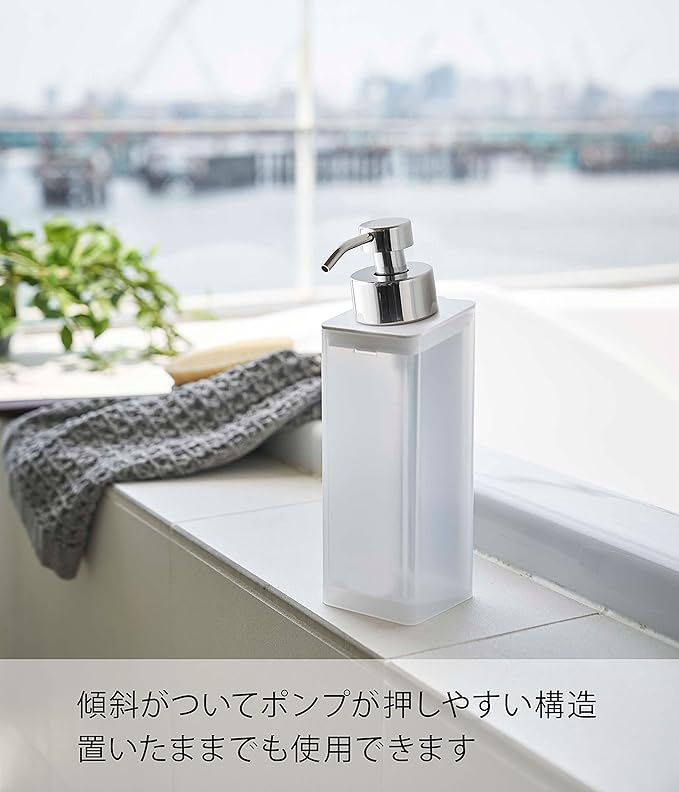 フィルムフックで壁面に浮かせて収納できるから、底がぬめらず衛生的。そのままポンプも押せます。壁面のフィルムフックにかけるだけ。蓋が外れるので、詰め替えが簡単。詰め替え用袋がそのまま入ります。蓋が外れるのでお手入れ簡単。