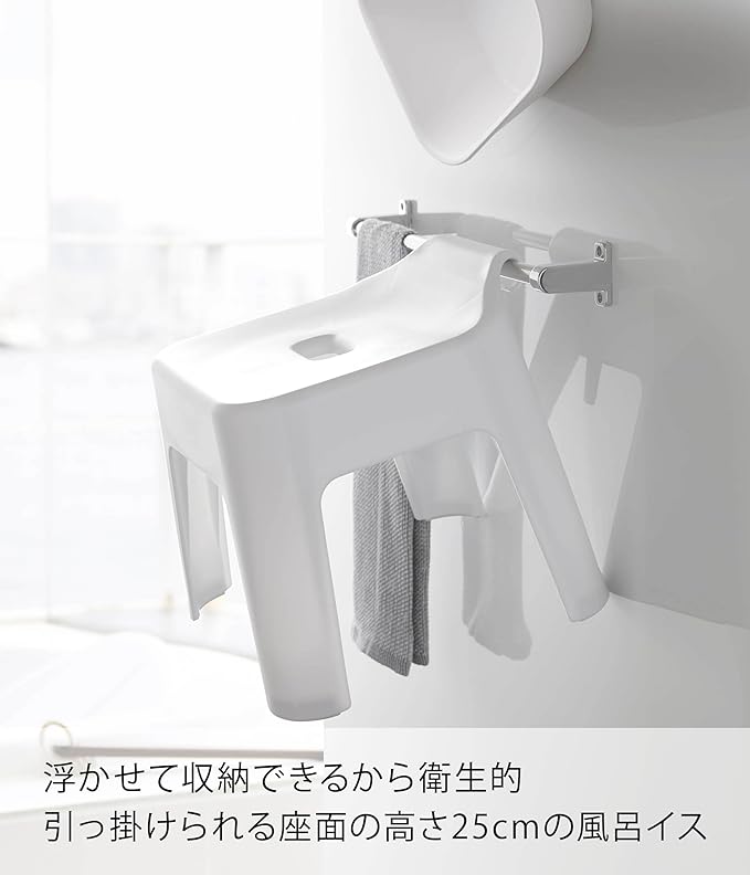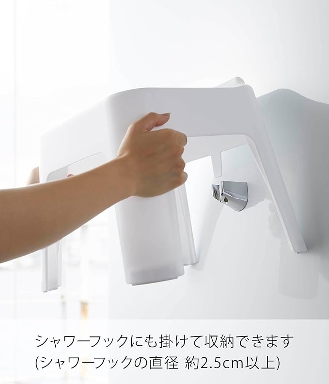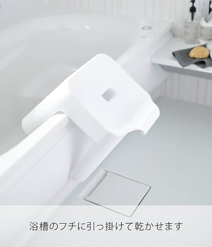 浴室のタオルバーなどに引っ掛けて乾かせる風呂イスです。3種類の引っ掛けパーツで、あらゆる場所に引っ掛けて収納可能。背もたれのフックで、タオルバーや物干しバー、扉のハンドルなどに引っ掛けて。背面の小さなプレートで、シャワーフックに引っ掛けることも可能。脚部分を浴槽のフチに引っ掛けても、いつでもサッと使えて便利です。浮かせて収納できるので乾きやすくて衛生的。脚のぬめりなども軽減できますし、掃除の際に邪魔にならないのも嬉しいポイントです。