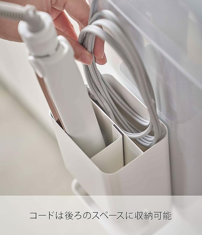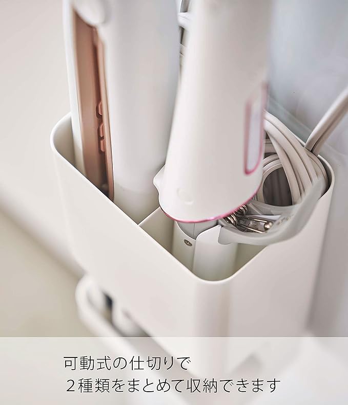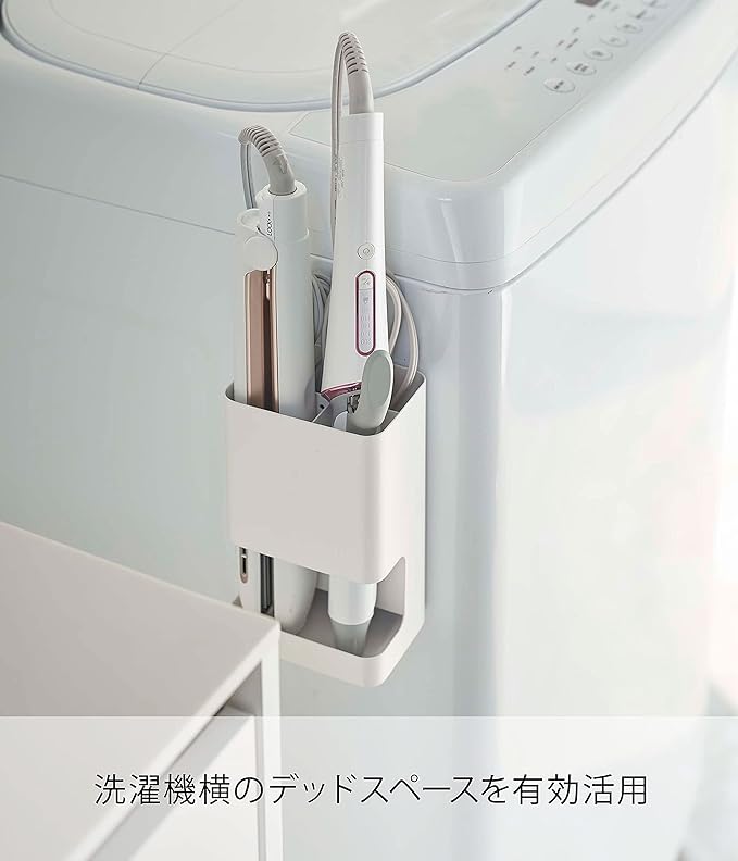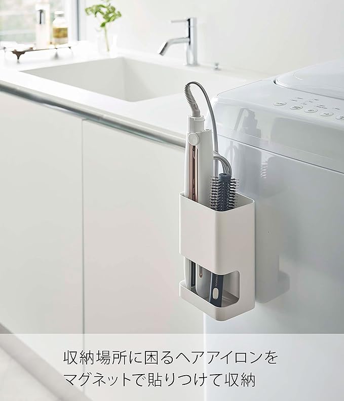 収納場所に困るヘアーアイロンをコンパクトに収納 towerマグネット仕切り付きヘアーアイロンホルダーは、使い終わってから邪魔になることが多いヘアーアイロンをコンパクトに収納できるグッズです。マグネット式ホルダーなので、ヘアーアイロンを収納して洗濯機の前面や側面などに貼り付けられます。置き場所に困るヘアーアイロンを、わずかなスペースに収納できる点がポイントです。本体サイズは、高さ16.5cm×幅10cm×奥行7.8cm、耐荷重量は 1.5kgとなっています。可動式の仕切りが付いているため、大きさの異なる2種類のヘアーアイロンを収納できます。また、コード収納用のスペースが別に設けられているため、コードが邪魔になることもありません。朝の身支度を快適にしてくれる収納グッズです。ヘアーアイロンの収納場所にお困りの方は、towerマグネット仕切り付きヘアーアイロンホルダーを使ってみませんか? ホワイトとブラックの2色展開 お洒落さんの中には、お部屋や洗濯機、ヘアーアイロンと収納グッズのテイストを合わせたい方がいるはず。towerマグネット仕切り付きヘアーアイロンホルダーは、ホワイトとブラックの2色展開となっています。好みで選べるので、おしゃれさんでも安心して使用できます。