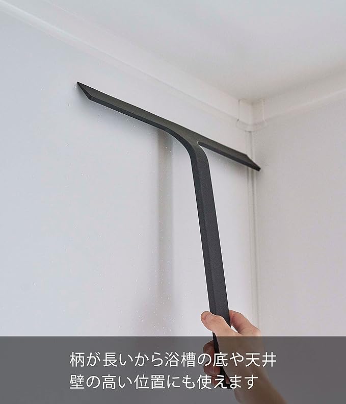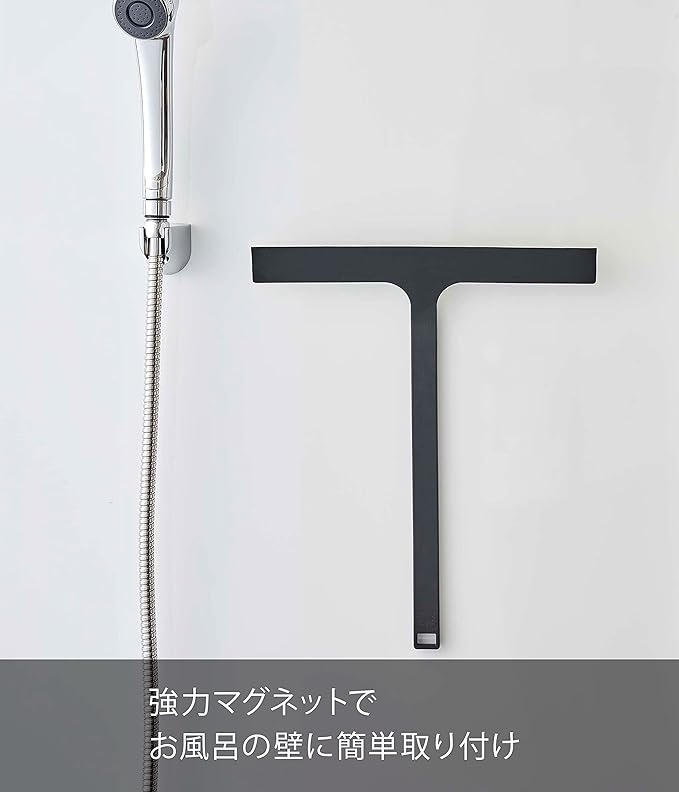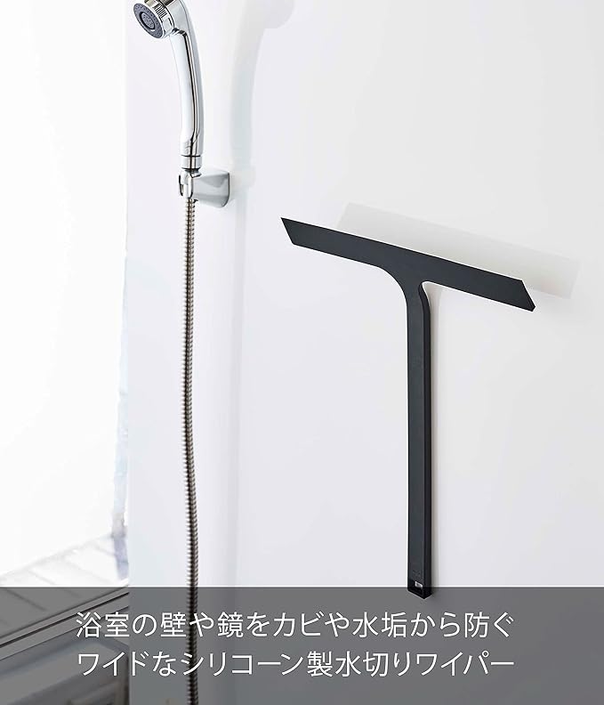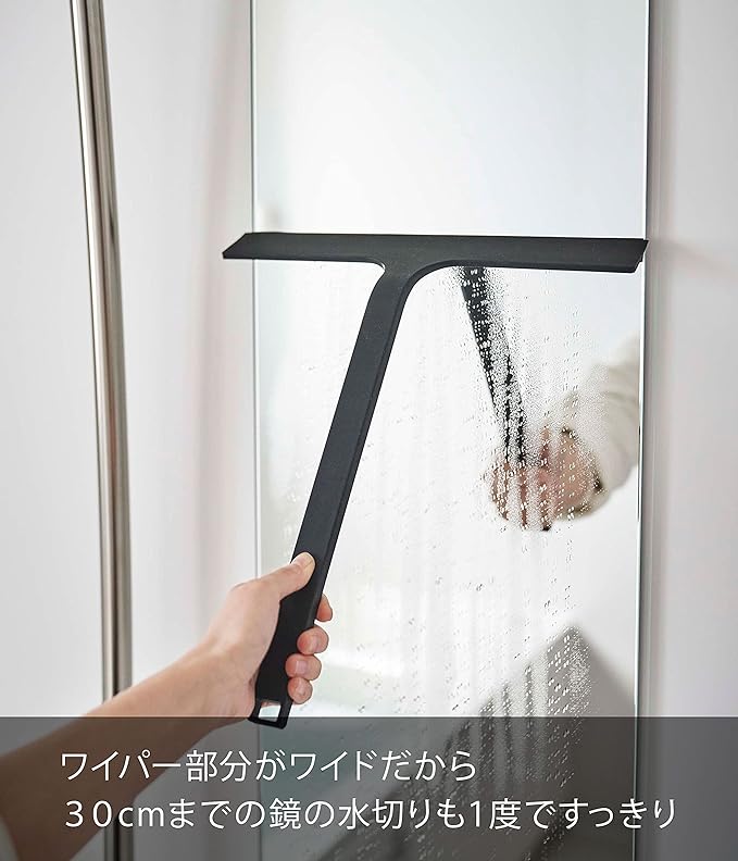 お風呂の壁に強力マグネットで簡単取り付け。浴室の壁や鏡をカビや水垢から防いでくれるシリコーン製水切りワイパー。ワイパー部分がワイドだから30cmまでの鏡の水切りも2度でスッキリ。柄が長いから浴槽の底や天井、壁の高い位置にも使えます。フックにもかけられます。