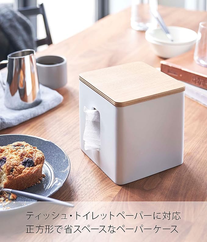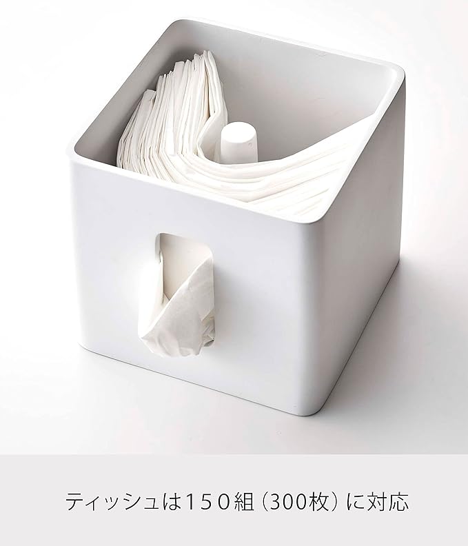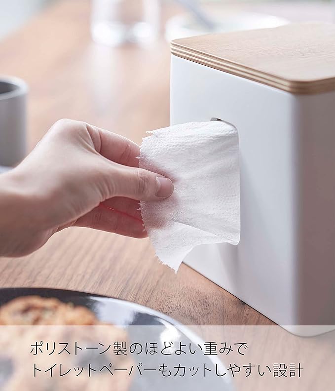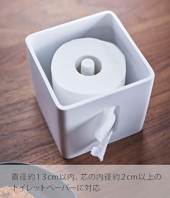 ティッシュとトイレットペーパーに対応。正方形で省スペースに収納。正方形の形状で卓上でも場所を取りません。ポリストーンのほどよい重みで、トイレットペーパーロールもカットしやすい設計です。ペットゲージなどのお掃除にも便利です。