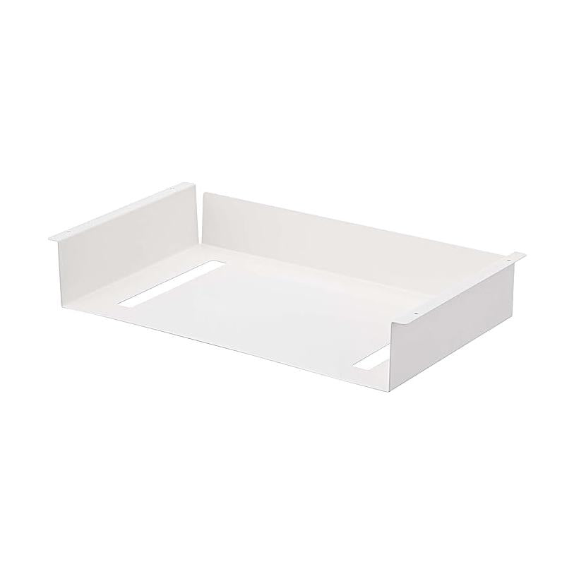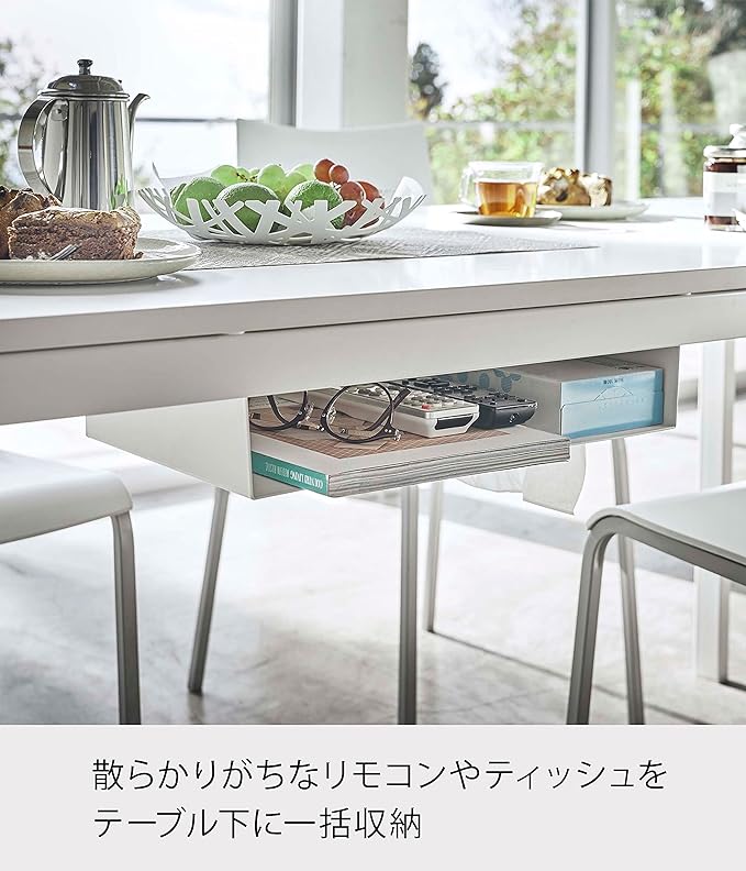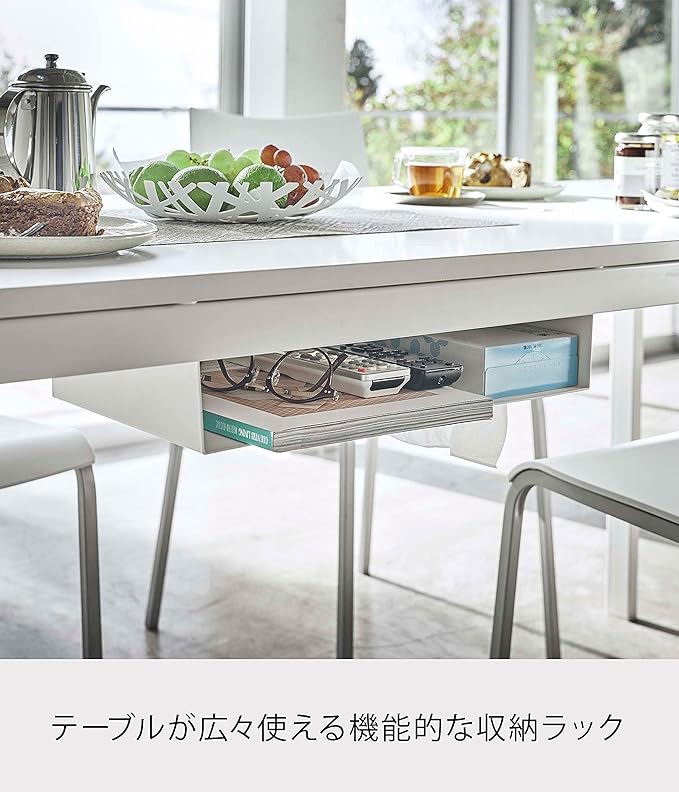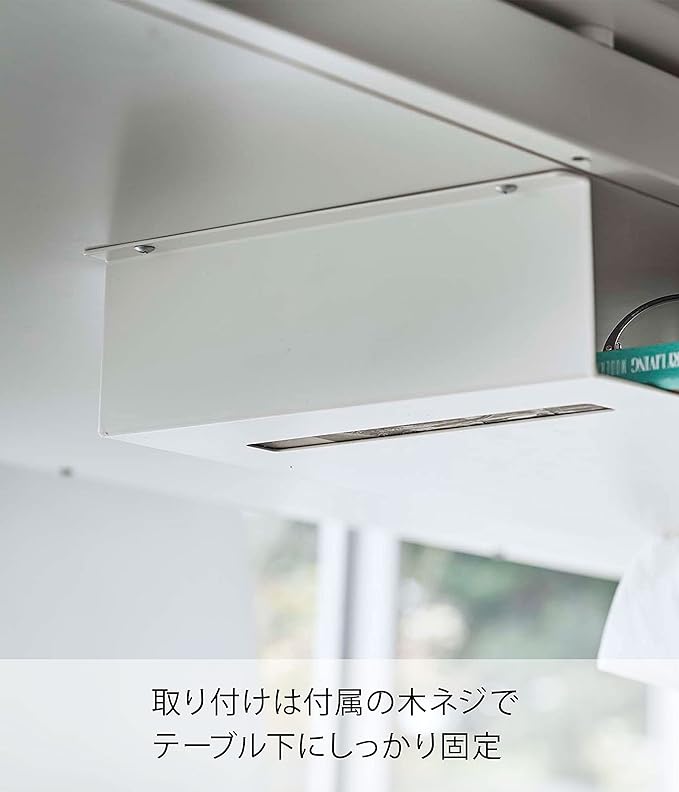 既存のテーブルに取り付けられる収納ラックダイニングやリビングのテーブルの下に取り付けられる収納ラックは、シンプルなつくりながら、あると便利なアイテム。テーブルの上で散らかりやすい日用品や小物、本類などを目立たない机の下にしまっておけます。テーブル下収納を使えば、テーブルの上はいつもすっきり。椅子に座った状態で、収納した日用品や小物を手に取りやすいのもポイントです。椅子に座っても脚に干渉しないよう高さは控えめですが、ワイド設計で収納力はしっかりキープ。4kgまでの収納に対応します。取り付けは4つのネジを止めるだけと簡単。シンプルな作業で、ご自宅のテーブルを収納付きに変えられます。カラーバリエーションはホワイトとブラックカラーバリエーションはクリーンなホワイトとシックなブラックの2色。どちらも既存のテーブルに合わせやすく、スチールの風合いがモダンな印象です。テーブル下収納でテーブルの上はいつでもすっきりティッシュや雑誌、リモコンなど、テーブルの上は日用品や小物で散らかりがち。使った筆記具やアクセサリーなどを置きっぱなしにしてしまうことも多いでしょう。テーブルの上に物がたくさんあると、一気に生活感が出て、ダイニングがごちゃごちゃした印象になってしまいます。テーブル下に収納があれば、テーブルの上の日用品や小物をさっとしまっておくことが可能。上に物がない状態を保てるので、テーブルはいつでも広々と使え、生活感も払拭できます。たっぷり収納できるのに邪魔にならないサイズ感収納ラックの高さは7cm。薄めなので、テーブルの椅子に座っても脚に当たることはありません。一方の横幅は内寸40cmとワイドなつくりになっており、耐荷重も4kgと十分。大きめの雑誌も複数のリモコンもまとめてしまっておける収納力をキープしています。底面にはスリットが入っており、中に入れたティッシュを下から取れる嬉しい工夫も。くしゃみが出そうな時も飲み物をこぼしてしまった時も、素早くさっとティッシュを取り出せます。不器用な方も安心な簡単取り付け取り付け作業は簡単。ドライバーと付属の木ネジ4本で、ラックをテーブルの下に固定するだけです。シンプルな作業なので、細かい作業が苦手な方や力がない方も安心。テーブルを逆さまに向けて作業を行えば、よりスムーズに取り付けできます。ただし、木ネジを取り付けた部分には3mm程度の穴があくのでご注意ください。