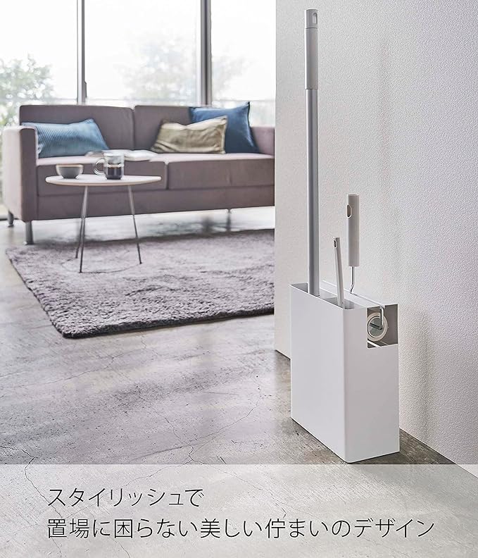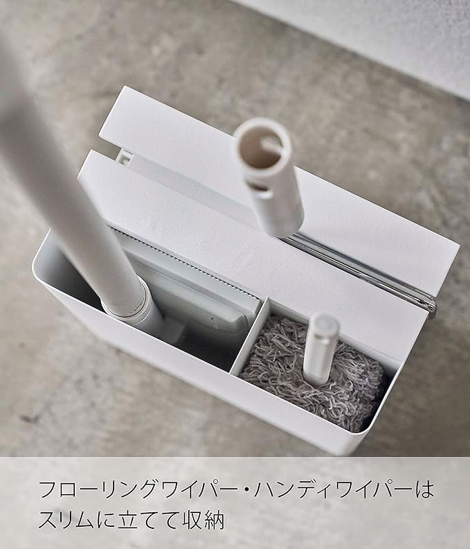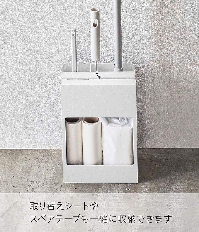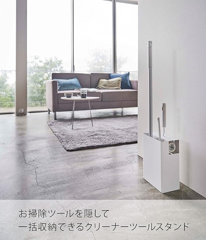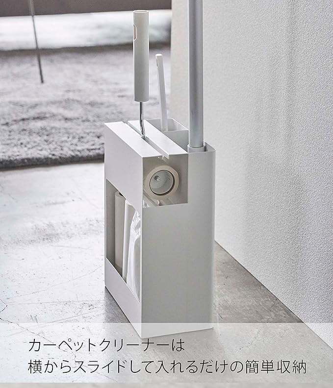 生活感の出やすいお掃除グッズは隠す収納で。クリーナーツールオーガナイザー 日々使うお掃除ツールをスタイリッシュに隠しておけるクリーナーツールスタンドです。ちょっとしたホコリなどを拭き取るのに便利なフローリングワイパーやハンディワイパーは、サッと使いやすいように立てて収納できます。自立が難しいカーペットクリーナーも、サイドから簡単に収納可能です。取り換え用シートやテープも一緒に収めることができるので、余計な動作が必要なくお掃除中でもあっという間にシートの交換ができます。取り換えシートのストックを購入してきたら、ここに収納するようにしましょう。生活感の出やすいお掃除ツールも、クリーナーツールオーガナイザーでお部屋がスッキリ見えします。どんなテイストのインテリアにも合わせやすい2種類のカラーバリエーション カラーは、清潔感のあるホワイトと、高級感のあるブラックをご用意しました。どんなお部屋にも合わせやすいカラーなので、お好みで選んでみてください。