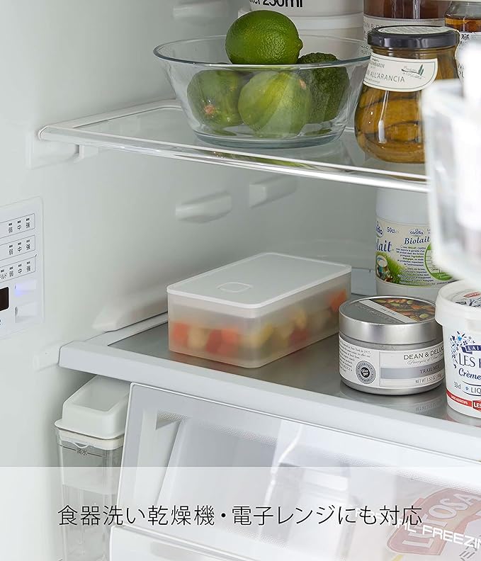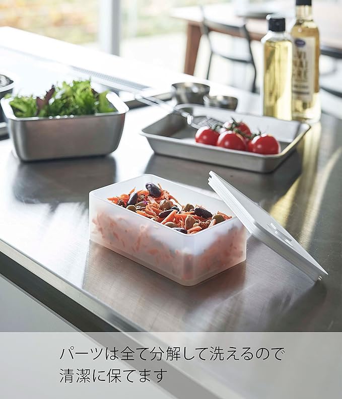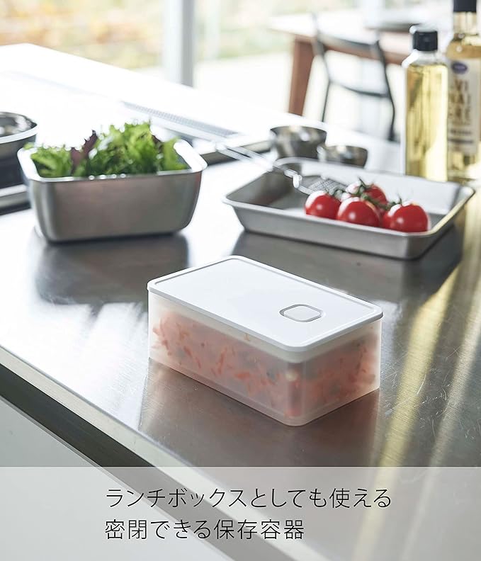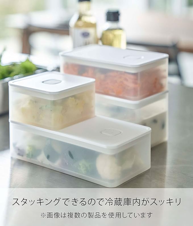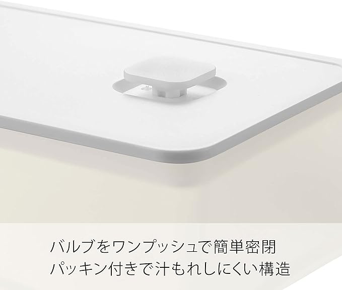 つくり置きおかずの保存に最適。バルブ付き密閉保存容器 食材の保存に便利なバルブ付き密閉保存容器です。下ごしらえをした食材や、作り置きのおかずを保存しておくのに便利です。バルブはワンプッシュで密閉可能。パッキンが付いているので液漏れしにくい構造になっています。ランチボックスとしてもお使いいただけます。シンプルながらも機能性を追求したつくりです。複数の容器を重ねられるので、スペースの限られている冷蔵庫の中でもコンパクトに収まります。サイズ違いで展開しているバルブ付き密閉容器も、スッキリと重ねられるようになっています。食材以外にも、調味料や茶葉などあらゆるものを保存できます。食洗器や電子レンジの使用が可能なので、使い勝手も抜群です。食材の色が映えやすい2種類のカラーバリエーション カラーは、爽やかなホワイトと、シックなブラックをご用意しました。どちらも彩り鮮やかな料理が映えやすいカラーなので、お好みで選んでください。