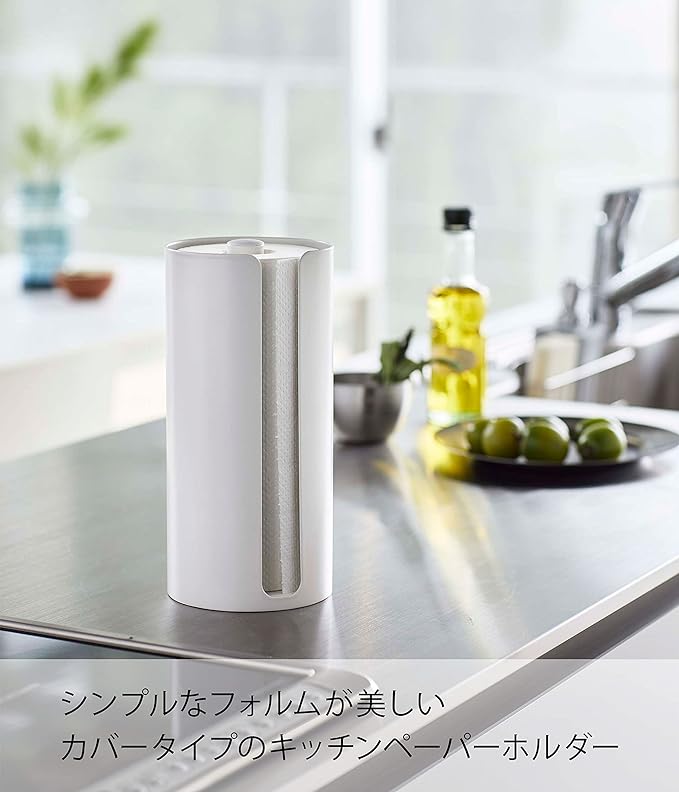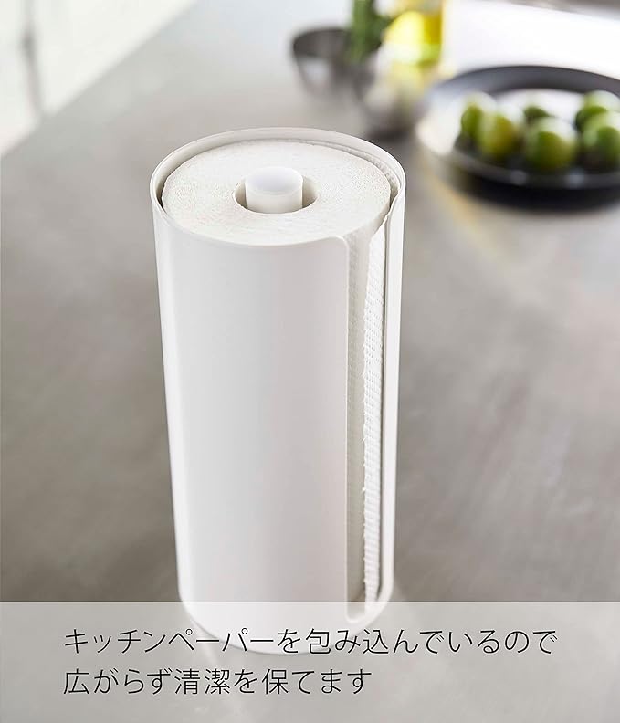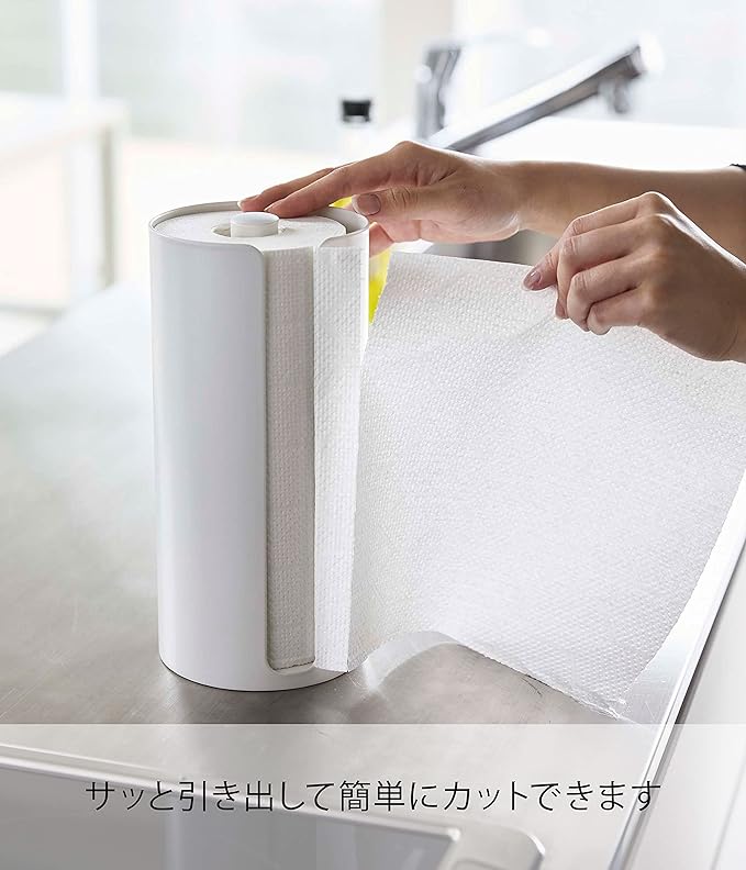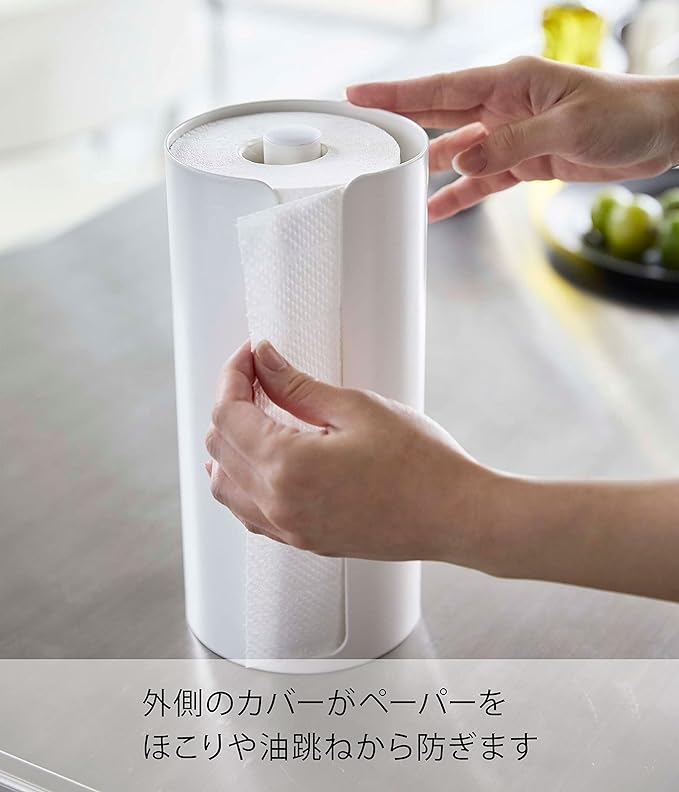 見た目も動作もスマートなキッチンペーパーホルダー キッチンに欠かせないキッチンペーパーをスマートに使いやすくを考えられて作られたキッチンペーパーホルダーです。キッチンペーパーの周りをまるっと覆って隠すのでホコリや油汚れを防ぎ、生活感も隠してくれます。キッチンに合わせやすい、2色のカラーバリエーション カラーは、明るい印象のホワイトと、スタイリッシュなブラックをご用意しました。どんなキッチンにもマッチしやすいモノトーンカラーです。ワークトップの色やキッチンの雰囲気に合わせて、お好きなカラーをお選びください。シンプルフォルムで設置スペースは最小限 横幅11.5cm×奥行き11.5cm×高さ24.5cmの、一般的なキッチンペーパーに合わせたサイズなので、キッチンの占有スペースを最小限におさめたスマートなホルダーです。底面に付属のクッションをつけることで、設置面にキズが付きにくくなります。使い勝手の良さもバッチリ。衛生的に使える 外側のカバーがキッチンペーパーを包み込みこむので清潔に使い続けられます。キッチンペーパーを使用する際はペーパーを引き出し、くの字のように手前に引っ張り簡単にカット。少し長めに引き出しておけば次に使うときも引き出しやすく便利です。直径11×高さ23cmのキッチンロールペーパーに対応しています。毎日の暮らしをよりスマートに どんな空間ともなじみの良いスタイリッシュさと、使い勝手の良さを追求したのが山崎実業の『tower』シリーズ。無駄を省き洗練されたデザインは機能性にも優れていて、毎日の生活をより快適に豊かにしてくれます。