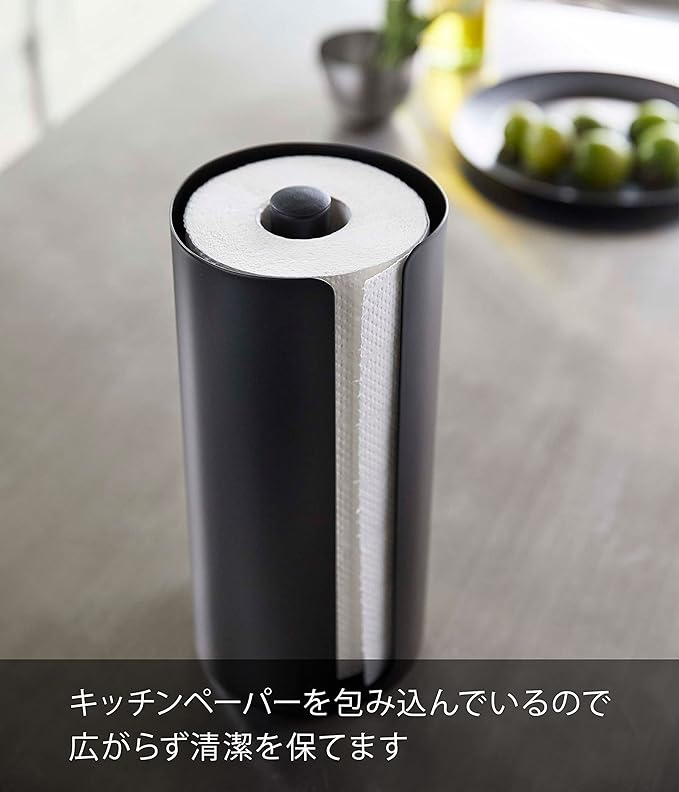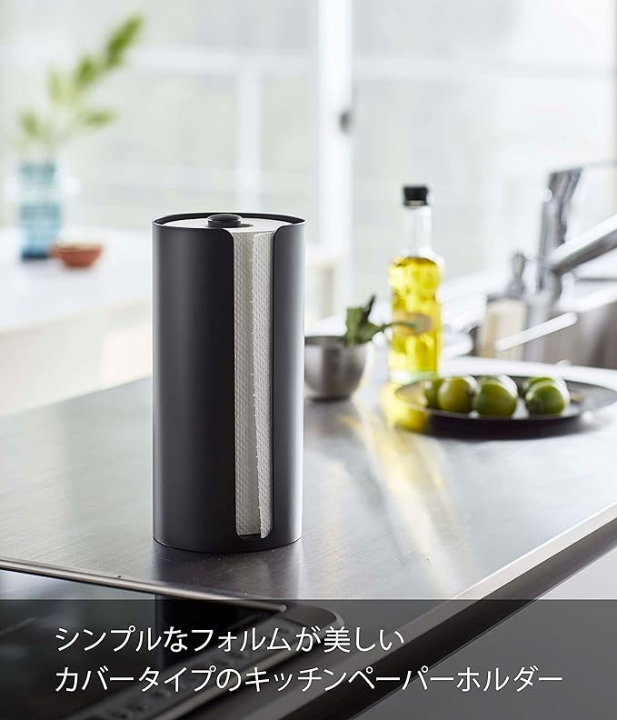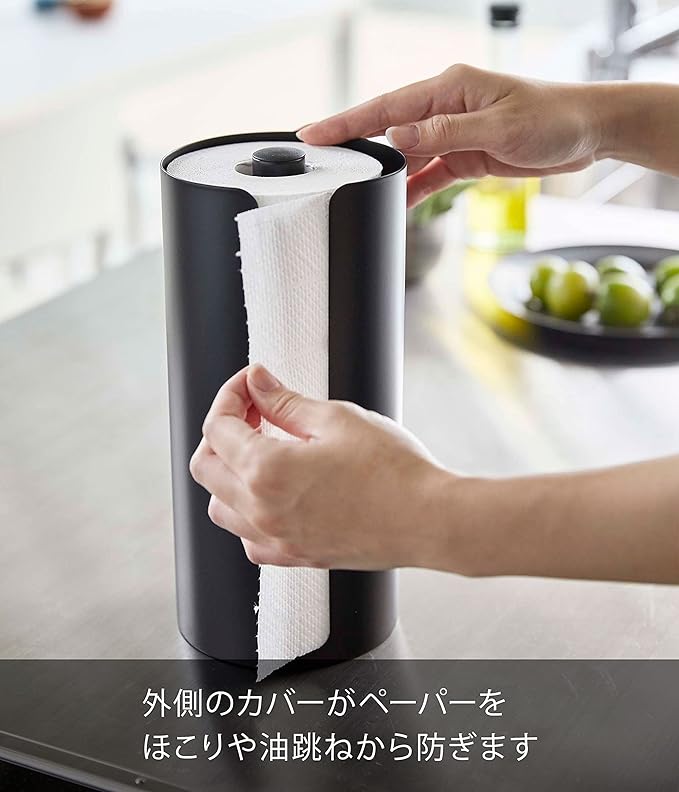 シンプルなフォルムが美しい。カバータイプの隠せるキッチンペーパーホルダー。外側のカバーがペーパーをほこりや油跳ねから防ぎ清潔に保ちます。キッチンペーパーを包み込んでいるので、清潔に保ち、広がりません。付属のクッションで設置面に傷がつきにくい仕様。さっと引き出して簡単にカットできます。