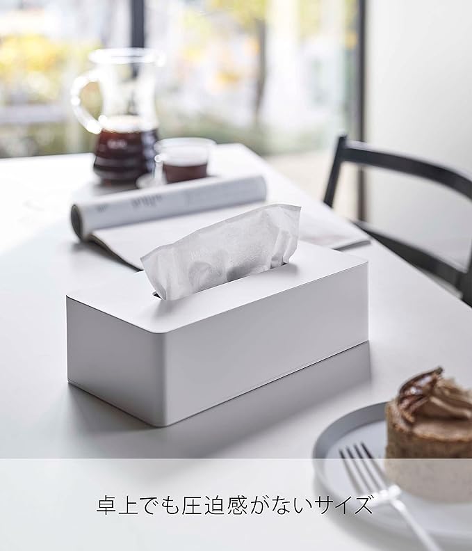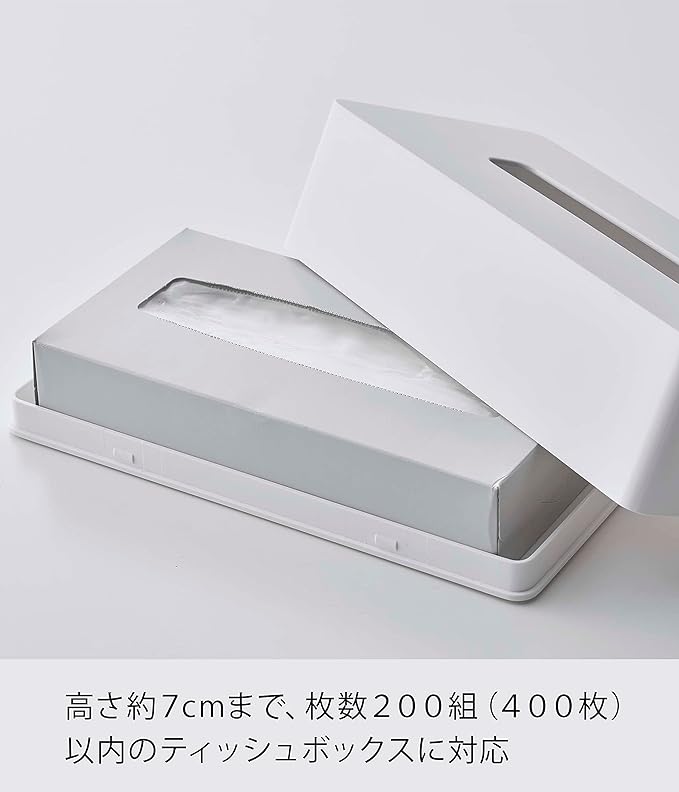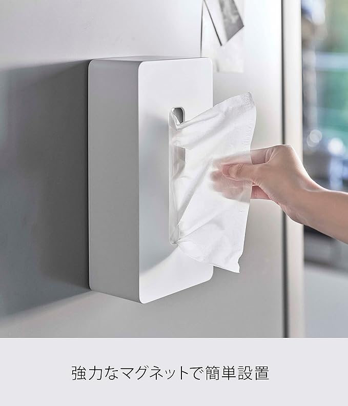 冷蔵庫にもデスク裏にも気軽にペタっと収納。マグネット ティッシュケース 生活感の出やすいティッシュボックスを、お部屋のインテリアに合わせてスタイリッシュにしてくれるティッシュケースです。高さが7cmまでのティッシュボックスなら、ボックスからティッシュを出すことなくそのままご使用いただけます。冷蔵庫やスチール製のデスクにピタッとくっつく背面マグネット仕様。ネジ固定式でないので、必要に応じて収納場所をササっと手軽に変えられます。ティッシュボックスのほか、ボックスタイプのキッチンペーパーやポリ袋収納にも活用可能です。片手でパッとティッシュを取りやすく、『空中収納』のおかげでお掃除もラクなので家事ストレスが軽減されます。どんなインテリアにも合わせやすい2種類のカラーバリエーション カラーは、明るい印象のホワイトと、シックなブラックをご用意しました。どんなお部屋の雰囲気にも合わせやすいカラーなので、お好みで選んでみてください。