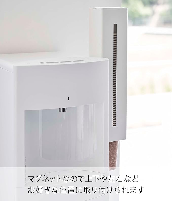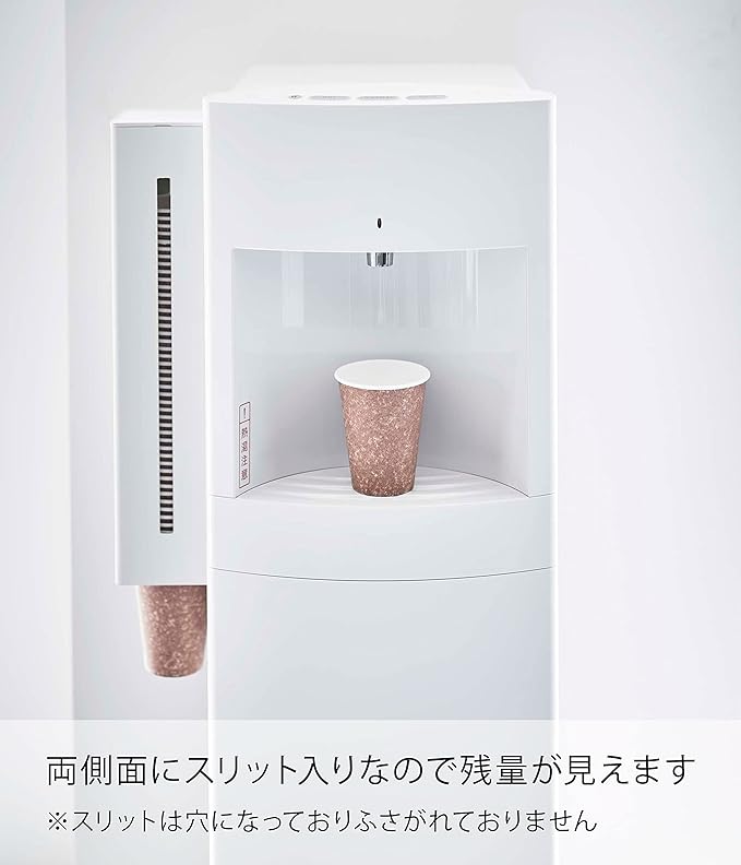 マグネットで取り付け簡単なカップディスペンサー 重ねた紙コップをそのままの向きで収納できるカップディスペンサーです。ウォーターサーバーやコーヒーメーカーの側面にマグネットで取り付けられ、高さの調節も簡単です。付属の木ネジを使うことで壁面の取り付けも可能です。下に引き出すだけでスマートに紙コップが取り出せます。モノトーン2種類から選べるカラーバリエーション ディスペンサーのカラーは清潔感のあるホワイトと、スタイリッシュな印象を与えるブラックの2色から選べます。ウォーターサーバーと色を揃えることで統一感が生まれ、インテリアや部屋の雰囲気を壊さず置けます。さまざまなサイズの紙コップに対応 サイズは幅9.5cm、奥行9.4cm、高さ40cmです。バックル(4つのツメ)を調節することで、直径5.2cm~8cm以内サイズの紙コップに対応しています。60~85個収納できるので、一度にたくさん補充しておきたい方におすすめです。ホコリやゴミの侵入を防ぐ、衛生的なフタ付き 紙コップを入れる上部はフタが付いています。ホコリや汚れが付着するのを防いでくれるから、いつでも清潔に保てます。コップの一時置きにも便利です。残量がひと目で分かる両側スリット 両サイドにはスリットが入っているので、ウォーターサーバーの左右どちらにも設置可能です。残量がひと目で分かるので、紙コップの補充・購入時のタイミングも見逃しません。