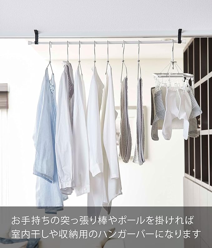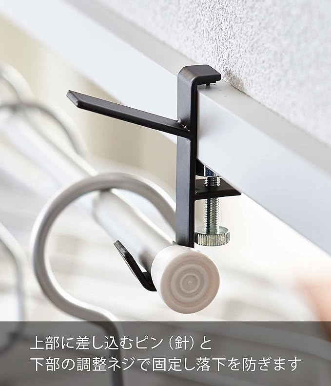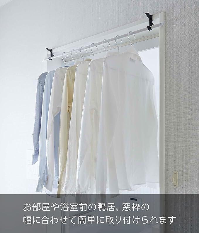足りない物干しスペースの確保に便利な室内物干しハンガーシリーズ。お部屋や浴室扉前の鴨居、窓枠などに簡単取り付け。洗濯物の干し場や収納としても使用できます。木製の鴨居・スライド扉枠・窓枠・机・棚に対応。枠の上部にピン(針)で刺し込んで落下を防ぎます。調整ネジで枠にしっかり固定できます。