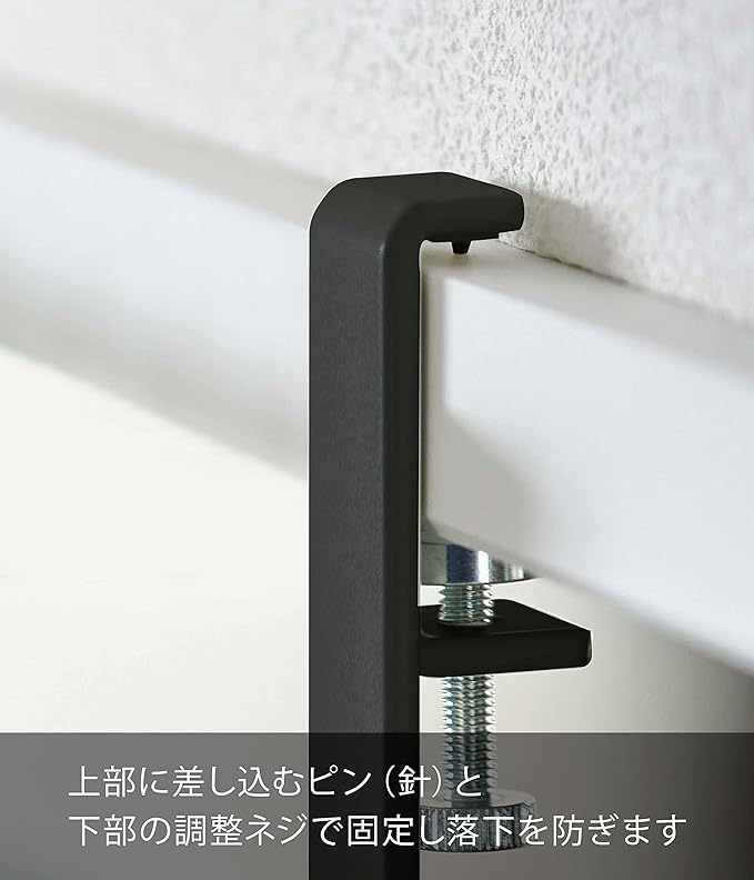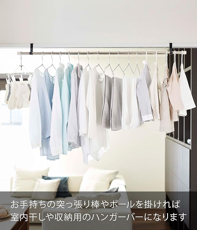 足りない物干しスペースの確保に便利な室内物干しハンガーシリーズ。お部屋や浴室扉前の鴨居、窓枠などに簡単取り付け。洗濯物の干し場や収納としても使用できます。木製の鴨居・スライド扉枠・窓枠・机・棚に対応。枠の上部にピン(針)で刺し込んで落下を防ぎます。調整ネジで枠にしっかり固定できます。