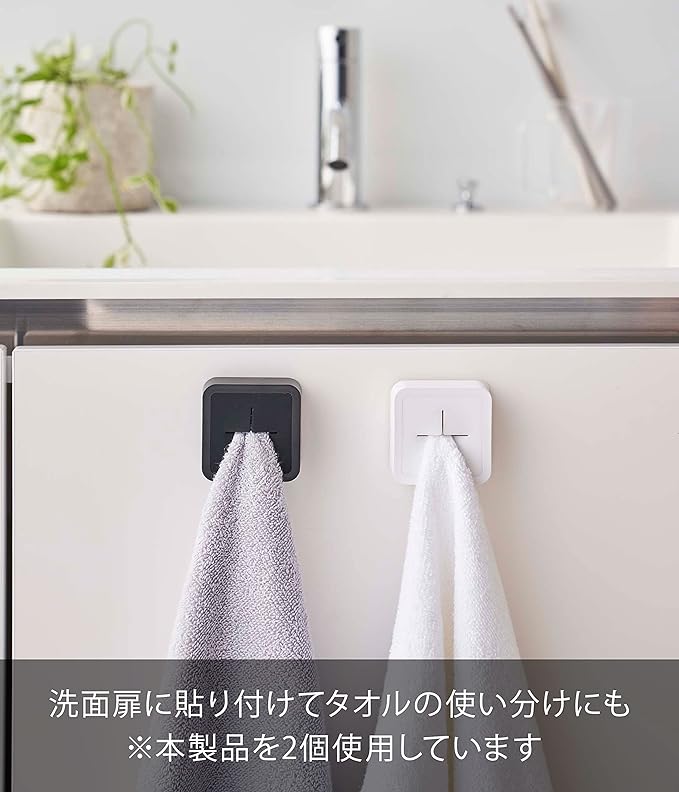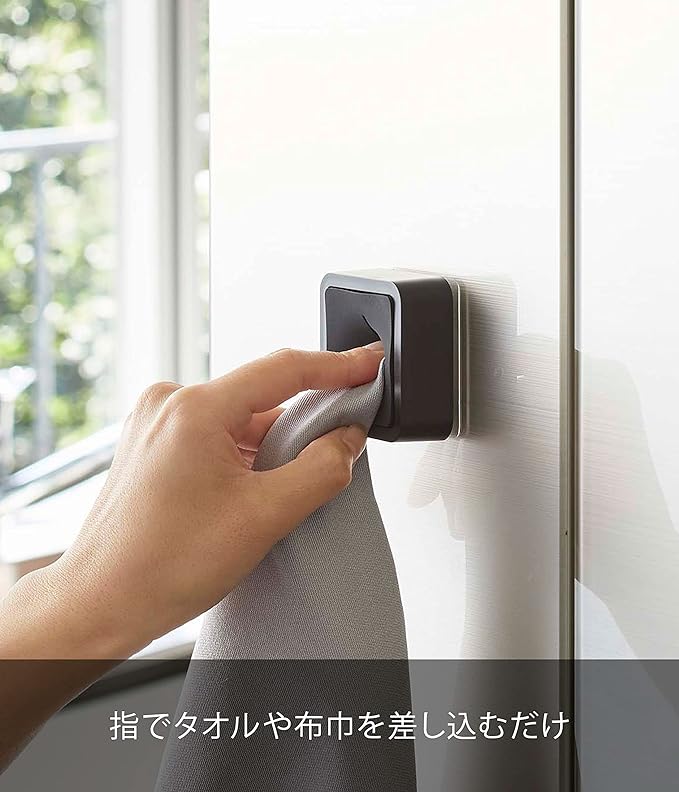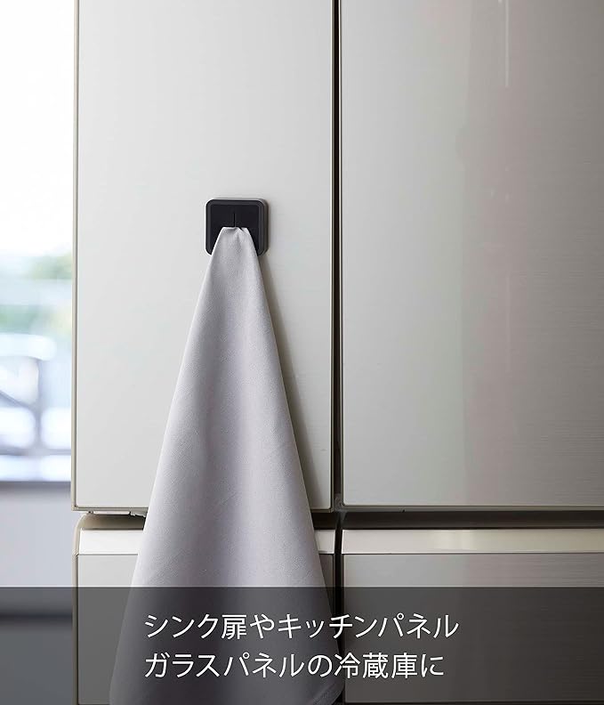 指で差し込むだけのタオルホルダー キッチンにあるととても便利。指で差し込むだけのタオルハンガーです。戸棚や冷蔵庫などの平らな面にフィルムフックを貼り付けるだけの簡単取り付け。場所を取らないので調理中にワークトップが食材や調理器具でいっぱいでも、タオルの置き場所に困りません。キッチンに合わせやすい、2色のカラーバリエーション カラーは、明るい印象のホワイトと、スタイリッシュなブラックをご用意しました。どんなにもキッチンにもマッチしやすいモノトーンカラーです。ワークトップの色やキッチンの雰囲気に合わせて、お好きなカラーをお選びください。設置場所に困らないコンパクトサイズ 大きさは5.5×2.3×5.5cmで、ちょっとしたスペースや隙間など設置する場所を見つけやすいコンパクトサイズです。フィルムフックの接着面よりも大きく、タイルやプラスチックなど光沢のある平らな油染みしない面に取り付けが可能です。ペタっと貼り付けるだけのフィルムフック仕様 フィルムフック仕様なので、マグネットがつかない戸棚の扉や引き出しなどにもかんたんに取り付けられます。キッチンはもちろん、洗面所に設置するのもおすすめ。色違いで調理中・調理以外や、家族での使い分けもできちゃいます。毎日の暮らしをよりスマートに どんな空間ともなじみの良いスタイリッシュさと、使い勝手の良さを追求したのが山崎実業の『tower』シリーズ。無駄を省き洗練されたデザインは機能性にも優れていて、毎日の生活をより快適に豊かにしてくれます。